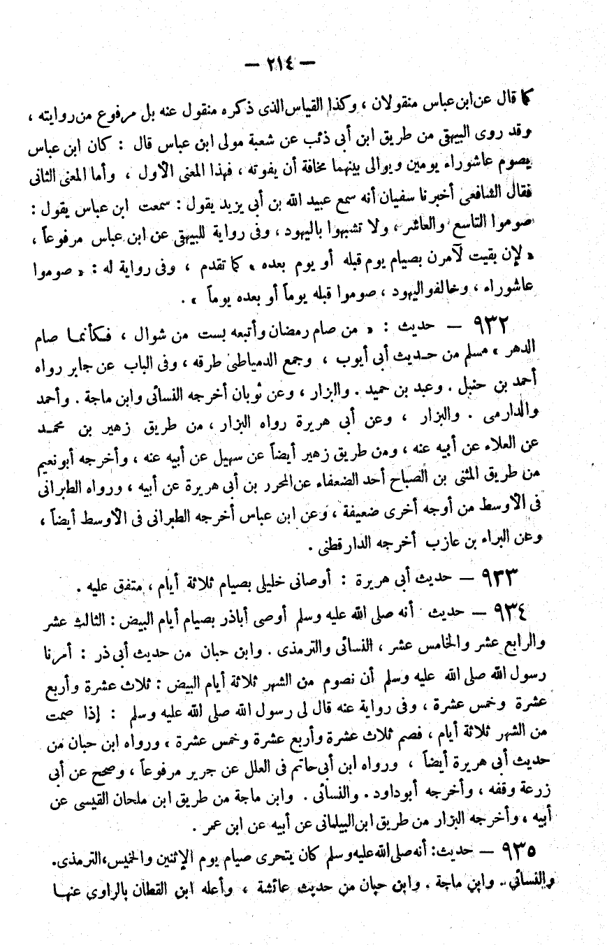 932 - حديث من صام رمضان وأتبعه بست من شوال فكأنما صام الدهر مسلم من حديث أبي أيوب وجمع الدمياطي طرقه وفي الباب عن جابر رواه أحمد بن حنبل وعبد بن حميد والبزار وعن ثوبان أخرجه النسائي وابن ماجة وأحمد والدارمي والبزار وعن أبي هريرة رواه البزار من طريق زهير بن محمد عن العلاء عن أبيه عنه ومن طريق زهير أيضا عن سهيل عن أبيه عنه وأخرجه أبو نعيم من طريق المثنى بن الصباح أحد الضعفاء عن المحرر بن أبي هريرة عن أبيه ورواه الطبراني في الأوسط من أوجه أخرى ضعيفة وعن بن عباس أخرجه الطبراني في الأوسط أيضا وعن البراء بن عازب أخرجه الدارقطني