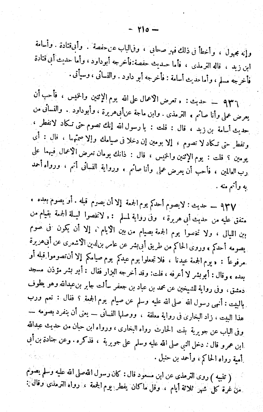937 - حديث لا يصوم أحدكم يوم الجمعة إلا أن يصوم قبله أو يصوم بعده متفق عليه من حديث أبي هريرة وفي رواية لمسلم لا تخصوا ليلة الجمعة بقيام من بين الليالي ولا تخصوا يوم الجمعة بصيام من بين الأيام إلا أن يكون في صوم يصومه أحدكم وروى الحاكم من طريق أبي بشر عن عامر بن الدين الأشعري عن أبي هريرة مرفوعا يوم الجمعة عيدنا فلا تجعلوا يوم عيدكم يوم صيامكم إلا أن تصوموا قبله أو بعده وقال أبو بشر لا أعرفه قلت وقد أخرجه البزار فقال أبو بشر مؤذن مسجد دمشق وفي رواية للشيخين عن محمد بن عباد بن جعفر سألت جابر بن عبد الله وهو يطوف بالبيت أنهى رسول الله صلى الله عليه و سلم عن صيام يوم الجمعة فقال نعم ورب هذا البيت زاد البخاري في رواية معلقة ووصلها النسائي يعني أن ينفرد بصومه وفي الباب عن جويرية بنت الحارث رواه البخاري ورواه بن حبان من حديث عبد الله بن عمرو قال دخل النبي صلى الله عليه و سلم على جويرية فذكره وعن جنادة بن أبي أمية رواه الحاكم وأحمد بن حنبل