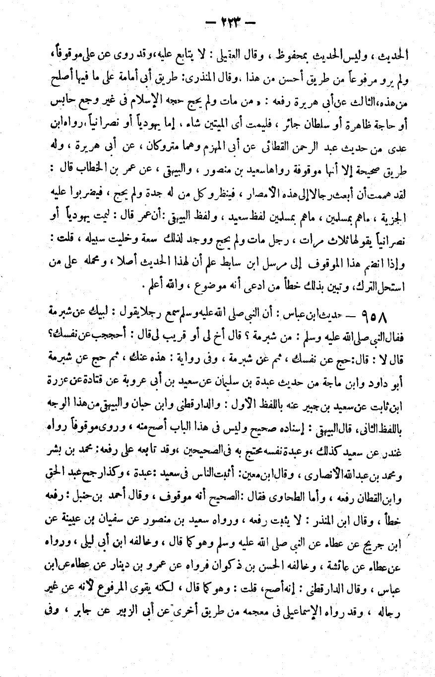 958 - حديث بن عباس أن النبي صلى الله عليه و سلم سمع رجلا يقول لبيك عن شبرمة فقال النبي صلى الله عليه و سلم من شبرمة قال أخ لي أو قريب لي قال أحججت عن نفسك قال لا قال حج عن نفسك ثم عن شبرمة وفي رواية هذه عنك ثم حج عن شبرمة أبو داود وابن ماجة من حديث عبدة بن سليمان عن سعيد بن أبي عروبة عن قتادة عن عزرة بن ثابت عن سعيد بن جبير عنه باللفظ الأول والدارقطني وابن حبان والبيهقي من هذا الوجه باللفظ الثاني قال البيهقي إسناده صحيح وليس في هذا الباب أصح منه وروي موقوفا رواه غندر عن سعيد كذلك وعبدة نفسه محتج به في الصحيحين وقد تابعه على رفعه محمد بن بشر ومحمد بن عبد الله الأنصاري وقال بن معين أثبت الناس في سعيد عبدة وكذا رجح عبد الحق وابن القطان رفعه وأما الطحاوي فقال الصحيح أنه موقوف وقال أحمد بن حنبل رفعه خطأ وقال بن المنذر لا يثبت رفعه ورواه سعيد بن منصور عن سفيان بن عيينة عن بن جريج عن عطاء عن النبي صلى الله عليه و سلم وهو كما قال وخالفه بن أبي ليلى ورواه عن عطاء عن عائشة وخالفه الحسن بن ذكوان فرواه عن عمرو بن دينار عن عطاء عن بن عباس وقال الدارقطني إنه أصح قلت وهو كما قال لكنه يقوي المرفوع لأنه عن غير رجاله وقد رواه الإسماعيلي في معجمه من طريق أخرى عن أبي الزبير عن جابر وفي