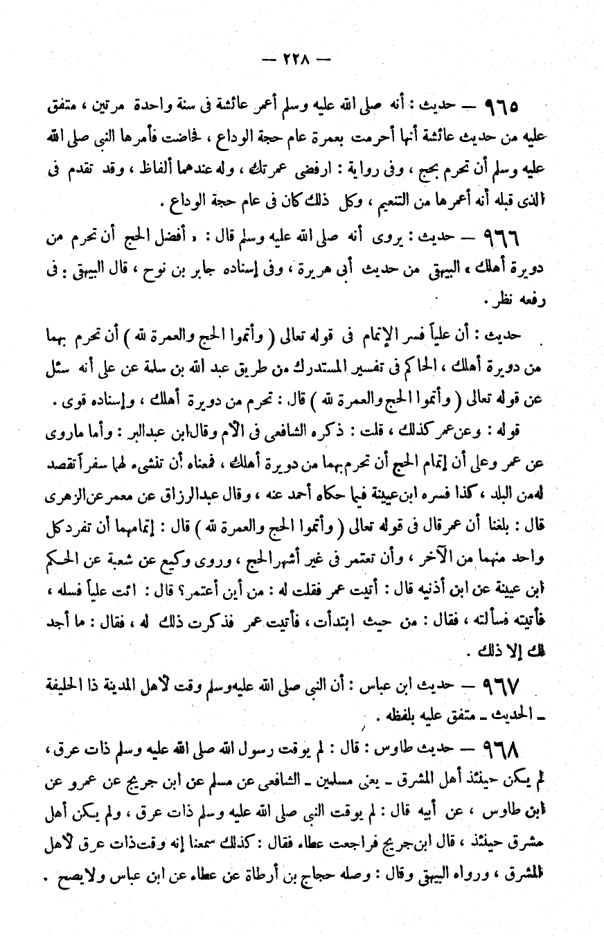 965 - حديث أنه صلى الله عليه و سلم أعمر عائشة في سنة واحدة مرتين متفق عليه من حديث عائشة أنها أحرمت بعمرة عام حجة الوداع فحاضت فأمرها النبي صلى الله عليه و سلم أن تحرم بحج وفي رواية ارفضي عمرتك وله عندهما ألفاظ وقد تقدم في الذي قبله أنه أعمرها من التنعيم وكل ذلك كان في عام حجة الوداع
