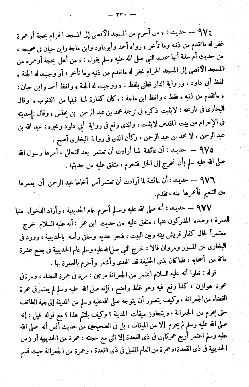 974 - حديث من أحرم من المسجد الأقصى إلى المسجد الحرام بحجة أو عمرة غفر له ما تقدم من ذنبه وما تأخر رواه أحمد وأبو داود وابن ماجة وابن حبان في صحيحه من حديث أم سلمة أنها سمعت النبي صلى الله عليه و سلم يقول من أهل بحجة أو عمرة من المسجد الأقصى إلى المسجد الحرام غفر له ما تقدم من ذنبه وما تأخر أو وجبت له الجنة لفظ أبي داود ورواية الدارقطني بلفظ ووجبت له الجنة ولفظ أحمد وابن حبان ما تقدم من ذنبه فقط ولفظ بن ماجة كان كفارة لما قبلها من الذنوب وقال البخاري في تاريخه لا يثبت ذكره في ترجمة محمد بن عبد الرحمن بن يحنس وقال حديثه في الإحرام من بيت المقدس لا يثبت والذي وقع في رواية أبي داود وغيره عبد الله بن عبد الرحمن لا محمد بن عبد الرحمن وكأن الذي في رواية البخاري أصح