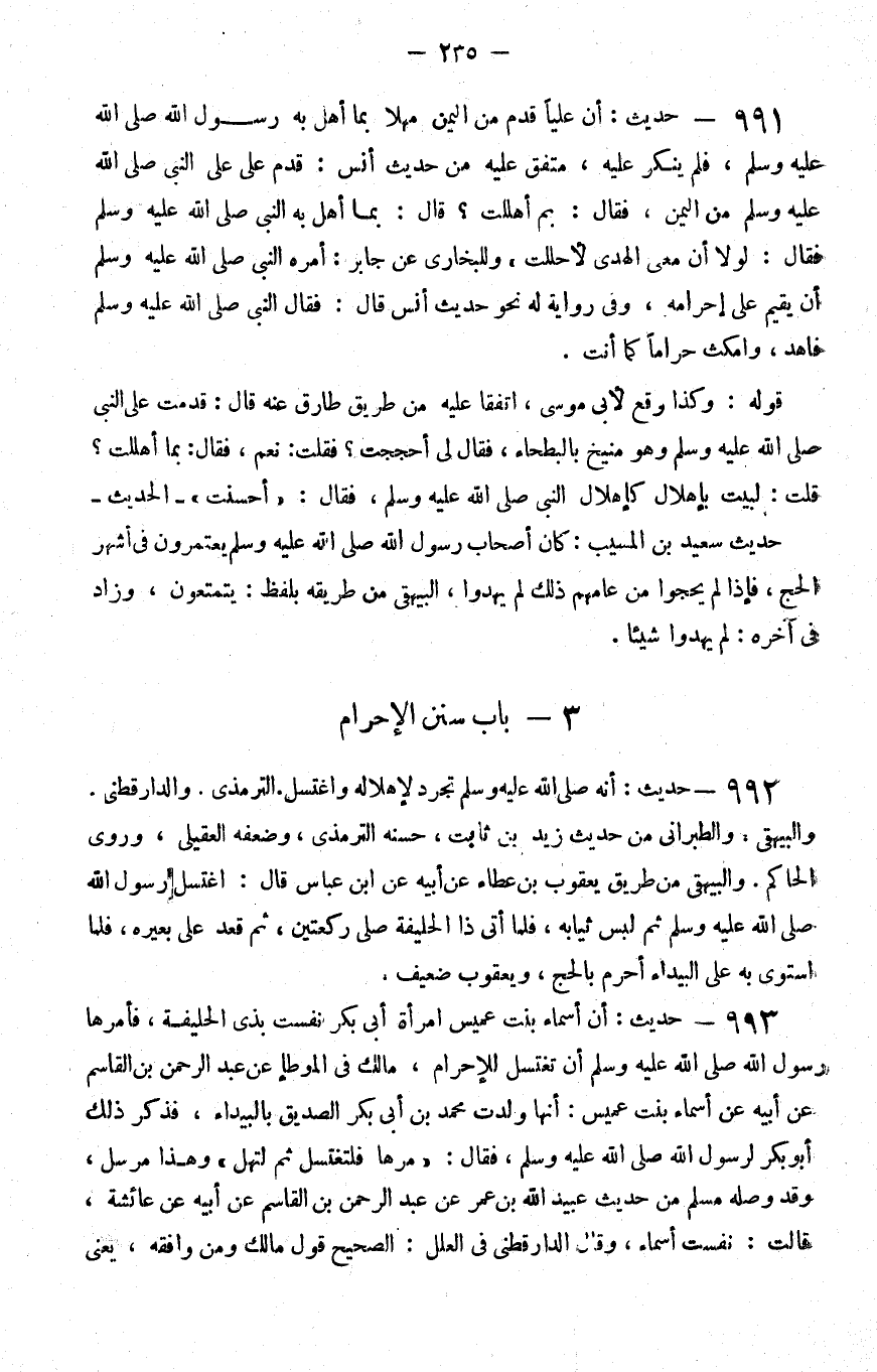 992 - حديث أنه صلى الله عليه و سلم تجرد لإهلاله واغتسل الترمذي والدارقطني والبيهقي والطبراني من حديث زيد بن ثابت حسنه الترمذي وضعفه العقيلي وروى الحاكم والبيهقي من طريق يعقوب بن عطاء عن أبيه عن بن عباس قال اغتسل رسول الله صلى الله عليه و سلم ثم لبس ثيابه فلما أتى ذا الحليفة صلى ركعتين ثم قعد على بعيره فلما استوى به على البيداء أحرم بالحج ويعقوب ضعيف