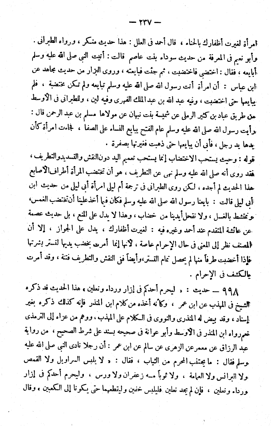 998 - حديث ليحرم أحدكم في إزار ورداء ونعلين هذا الحديث قد ذكره الشيخ في المهذب عن بن عمر وكأنه أخذه من كلام بن المنذر فإنه كذلك ذكره بغير إسناد وقد بيض له المنذري والنووي في الكلام على المهذب ووهم من عزاه إلى الترمذي نعم رواه بن المنذر في الأوسط وأبو عوانة في صحيحه بسند على شرط الصحيح من رواية عبد الرزاق عن معمر عن الزهري عن سالم عن بن عمر أن رجلا نادى النبي صلى الله عليه و سلم فقال ما يجتنب المحرم من الثياب فقال لا يلبس السراويل ولا القمص ولا البرانس ولا العمامة ولا ثوبا مسه زعفران ولا ورس وليحرم أحدكم في إزار ورداء ونعلين فإن لم يجد نعلين فليلبس خفين وليقطعهما حتى يكونا إلى الكعبين وقال