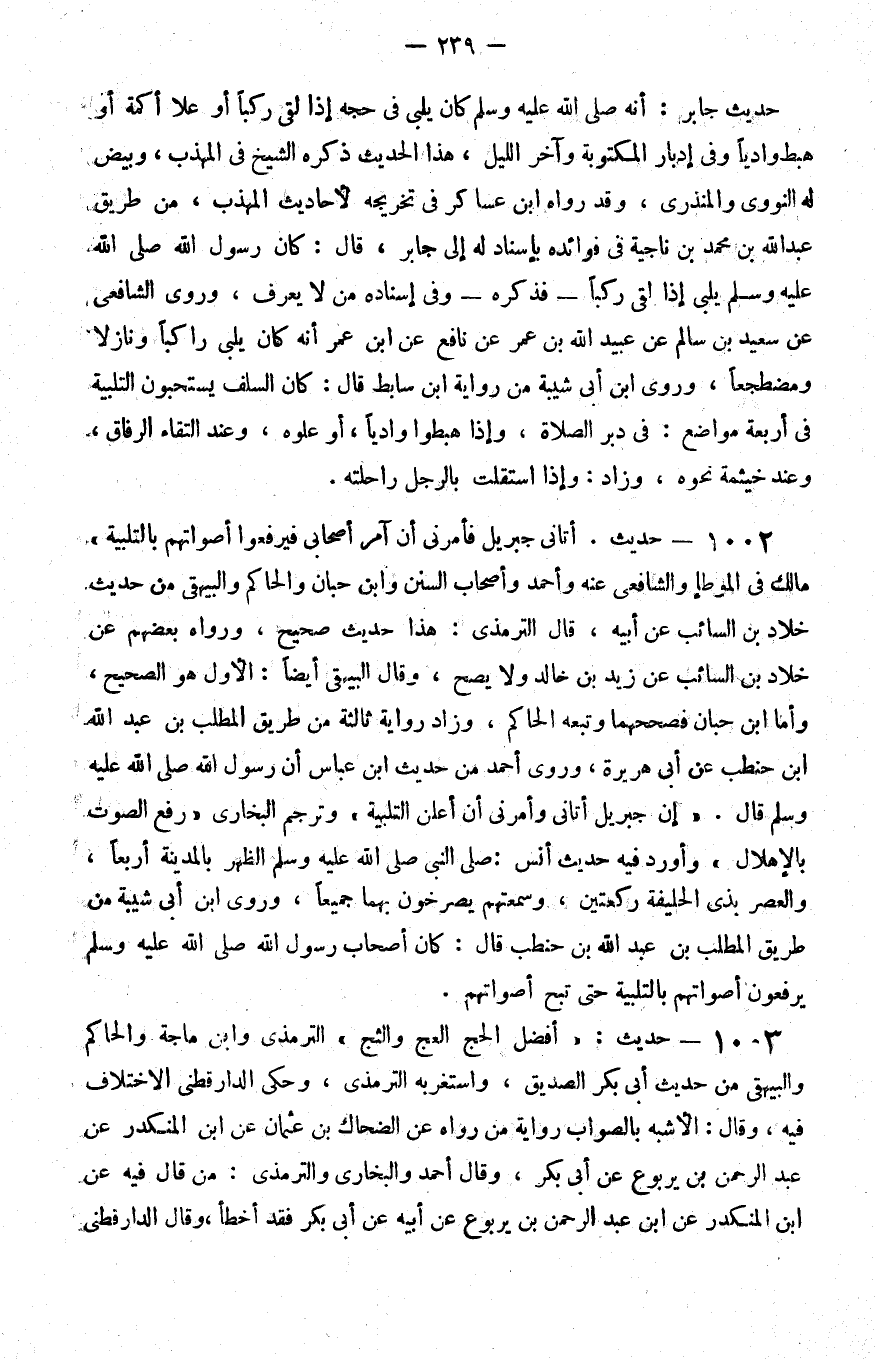 حديث جابر أنه صلى الله عليه و سلم كان يلبي في حجه إذا لقي ركبا أو علا أكمة أو هبط واديا وفي إدبار المكتوبة وآخر الليل هذا الحديث ذكره الشيخ في المهذب وبيض له النووي والمنذري وقد رواه بن عساكر في تخريجه لأحاديث المهذب من طريق عبد الله بن محمد بن ناجية في فوائده بإسناد له إلى جابر قال كان رسول الله صلى الله عليه و سلم يلبي إذا لقي ركبا فذكره وفي إسناده من لا يعرف وروى الشافعي عن سعيد بن سالم عن عبيد الله بن عمر عن نافع عن بن عمر أنه كان يلبي راكبا ونازلا ومضطجعا وروى بن أبي شيبة من رواية بن سابط قال كان السلف يستحبون التلبية في أربعة مواضع في دبر الصلاة وإذا هبطوا واديا أو علوه وعند التقاء الرفاق وعند خيثمة نحوه وزاد وإذا استقلت بالرجل راحلته