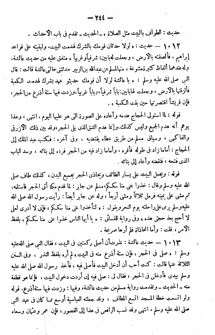 1013 - حديث عائشة نذرت أن أصلي ركعتين في البيت فقال النبي صلى الله عليه و سلم صلي في الحجر فإن ستة أذرع منه في البيت لم أره بلفظ النذر وفي السنن الثلاثة عنها قالت كنت أحب أن أدخل البيت فأصلي فيه فأخذ رسول الله صلى الله عليه و سلم بيدي فأدخلني في الحجر فقال لي صلي فيه إن أردت دخول البيت فإنما هو قطعة منه الحديث وتقدمت رواية مسلم من حديث عائشة وفيها وزدت فيها ستة أذرع قوله ولو اتسعت خطة المسجد واتسع المطاف وقد جعلته العباسية أوسع مما كان في عهد النبي صلى الله عليه و سلم انتهى وقد نسب الرافعي في هذا إلى القصور فإن عمر وعثمان وسعاه