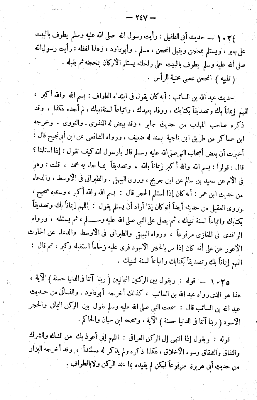 1024 - حديث أبي الطفيل رأيت رسول الله صلى الله عليه و سلم يطوف بالبيت على بعير ويستلم بمحجن ويقبل المحجن مسلم وأبو داود وهذا لفظه رأيت رسول الله صلى الله عليه و سلم يطوف بالبيت على راحلته يستلم الأركان بمحجنه ثم يقبله