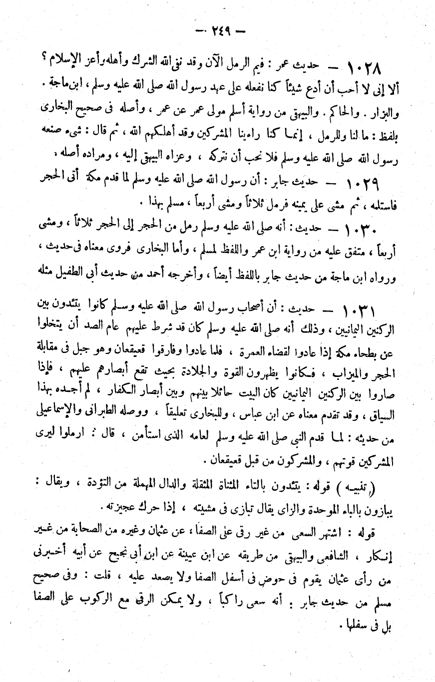 1030 - حديث أنه صلى الله عليه و سلم رمل من الحجر إلى الحجر ثلاثا ومشى أربعا متفق عليه من رواية بن عمر واللفظ لمسلم وأما البخاري فروى معناه في حديث ورواه بن ماجة من حديث جابر باللفظ أيضا وأخرجه أحمد من حديث أبي الطفيل مثله