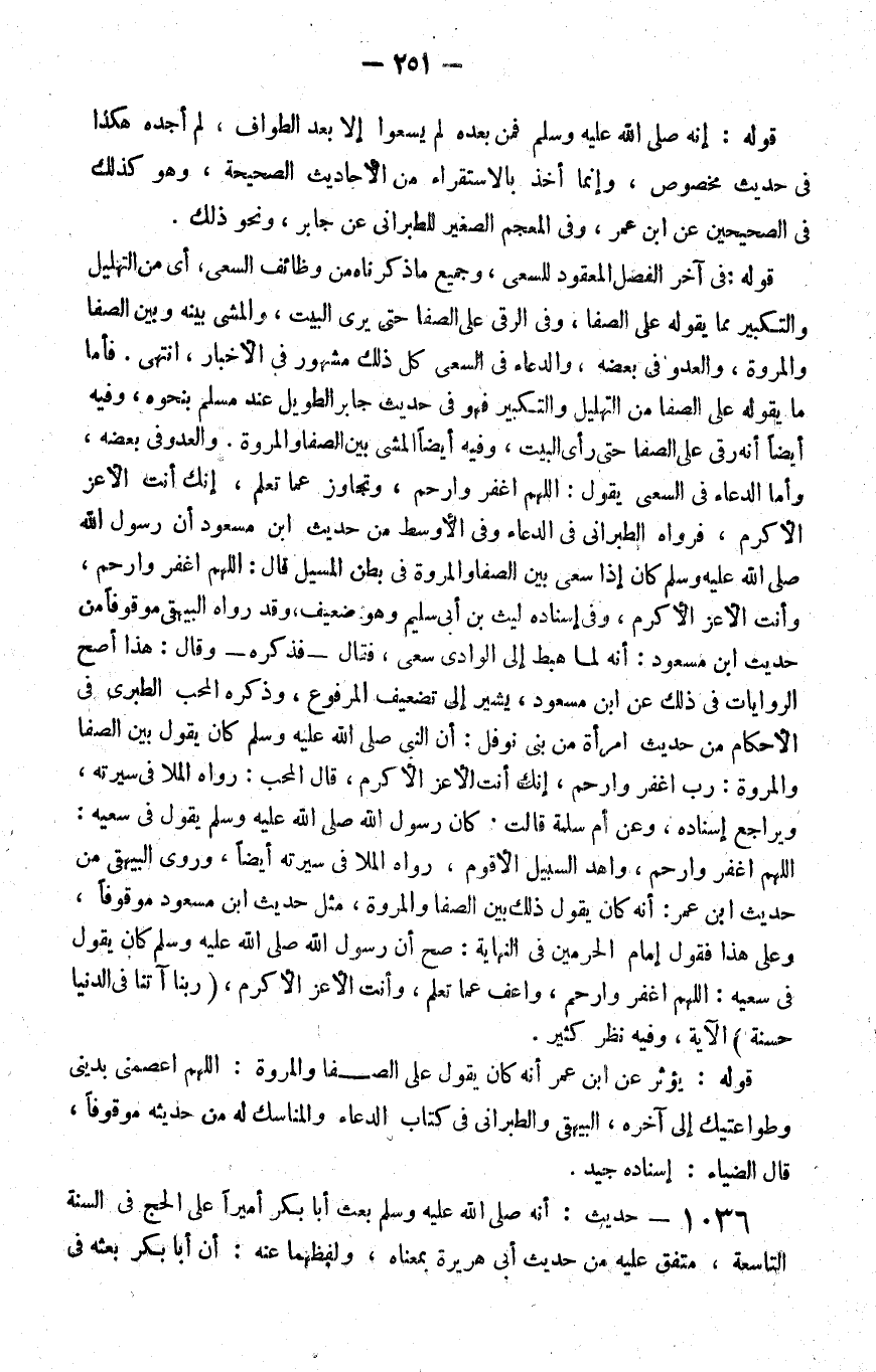 قوله في آخر الفصل المعقود للسعي وجميع ما ذكرناه من وظائف السعي أي من التهليل والتكبير مما يقوله على الصفا وفي الرقي على الصفا حتى يرى البيت والمشي بينه وبين الصفا والمروة والعدو في بعضه والدعاء في السعي كل ذلك مشهور في الأخبار انتهى فأما ما يقوله على الصفا من التهليل والتكبير فهو في حديث جابر الطويل عند مسلم بنحوه وفيه أيضا أنه رقى على الصفا حتى رأى البيت وفيه أيضا المشي بين الصفا والمروة والعدو في بعضه وأما الدعاء في السعي يقول اللهم اغفر وارحم وتجاوز عما تعلم إنك أنت الأعز الأكرم فرواه الطبراني في الدعاء وفي الأوسط من حديث بن مسعود أن رسول الله صلى الله عليه و سلم كان إذا سعى بين الصفا والمروة في بطن المسيل قال اللهم اغفر وارحم وأنت الأعز الأكرم وفي إسناده ليث بن أبي سليم وهو ضعيف وقد رواه البيهقي موقوفا من حديث بن مسعود أنه لما هبط إلى الوادي سعى فقال فذكره وقال هذا أصح الروايات في ذلك عن بن مسعود يشير إلى تضعيف المرفوع وذكره المحب الطبري في الأحكام من حديث امرأة من بني نوفل أن النبي صلى الله عليه و سلم كان يقول بين الصفا والمروة رب اغفر وارحم إنك أنت الأعز الأكرم قال المحب رواه الملا في سيرته ويراجع إسناده وعن أم سلمة قالت كان رسول الله صلى الله عليه و سلم يقول في سعيه اللهم اغفر وارحم واهد السبيل الأقوم رواه الملا في سيرته أيضا وروى البيهقي من حديث بن عمر أنه كان يقول ذلك بين الصفا والمروة مثل حديث بن مسعود موقوفا وعلى هذا فقول إمام الحرمين في النهاية صح أن رسول الله صلى الله عليه و سلم كان يقول في سعيه اللهم اغفر وارحم واعف عما تعلم وأنت الأعز الأكرم ربنا آتنا في الدنيا حسنة الآية وفيه نظر كثير