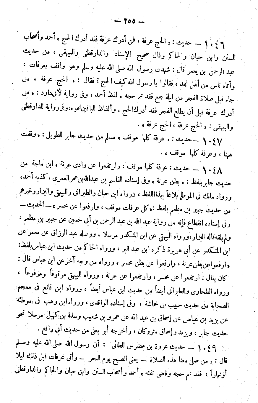 1046 - حديث الحج عرفة فمن أدرك عرفة فقد أدرك الحج أحمد وأصحاب السنن وابن حبان والحاكم وقال صحيح الإسناد والدارقطني والبيهقي من حديث عبد الرحمن بن يعمر قال شهدت رسول الله صلى الله عليه و سلم وهو واقف بعرفات وأتاه ناس من أهل نجد فقالوا يا رسول الله كيف الحج فقال الحج عرفة من جاء قبل صلاة الفجر من ليلة جمع فقد تم حجه لفظ أحمد وفي رواية لأبي داود من أدرك عرفة قبل أن يطلع الفجر فقد أدرك الحج وألفاظ الباقين نحوه وفي رواية للدارقطني والبيهقي الحج عرفة الحج عرفة