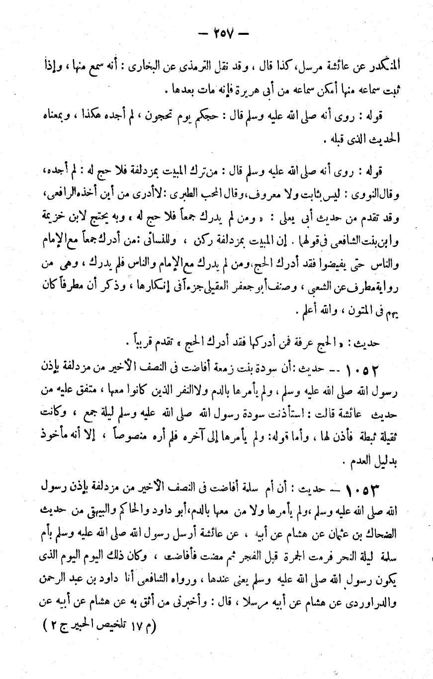 1052 - حديث أن سودة بنت زمعة أفاضت في النصف الأخير من مزدلفة بإذن رسول الله صلى الله عليه و سلم ولم يأمرها بالدم ولا النفر الذين كانوا معها متفق عليه من حديث عائشة قالت استأذنت سودة رسول الله صلى الله عليه و سلم ليلة جمع وكانت ثقيلة ثبطة فأذن لها وأما قوله ولم يأمرها إلى آخره فلم أره منصوصا إلا أنه مأخوذ بدليل العدم