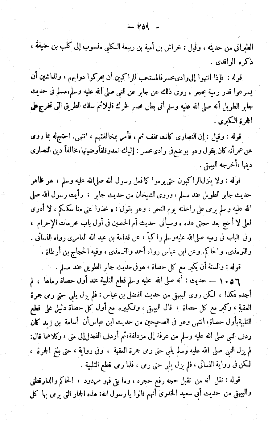 1056 - حديث أنه صلى الله عليه و سلم قطع التلبية عند أول حصاة رماها لم أجده هكذا لكن روى البيهقي من حديث الفضل بن عباس فلم يزل يلبي حتى رمى جمرة العقبة وكبر مع كل حصاة قال البيهقي وتكبيره مع أول كل حصاة دليل على قطع التلبية بأول حصاة انتهى وهو في الصحيحين من حديث بن عباس أن أسامة بن زيد كان ردف النبي صلى الله عليه و سلم من عرفة إلى مزدلفة ثم أردف الفضل إلى منى وكلاهما قال لم يزل النبي صلى الله عليه و سلم يلبي حتى رمى جمرة العقبة وفي رواية حتى بلغ الجمرة لكن في رواية النسائي فلم يزل يلبي حتى رمى فلما رمى قطع التلبية