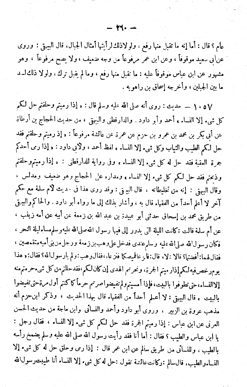 1057 - حديث روي أنه صلى الله عليه و سلم قال إذا رميتم وحلقتم حل لكم كل شيء إلا النساء أحمد وأبو داود والدارقطني والبيهقي من حديث الحجاج بن أرطاة عن أبي بكر بن محمد بن عمرو بن حزم عن عمرة عن عائشة مرفوعا إذا رميتم وحلقتم فقد حل لكم الطيب والثياب وكل شيء إلا النساء لفظ أحمد ولأبي داود إذا رمى أحدكم جمرة العقبة فقد حل له كل شيء إلا النساء وفي رواية للدارقطني إذا رميتم وحلقتم وذبحتم فقد حل لكم كل شيء إلا النساء ومداره على الحجاج وهو ضعيف ومدلس وقال البيهقي إنه من تخليطاته قال البيهقي وقد روي هذا في حديث لأم سلمة مع حكم آخر لا أعلم أحدا من الفقهاء قال به وأشار بذلك إلى ما رواه أبو داود والحاكم والبيهقي من طريق محمد بن إسحاق حدثني أبو عبيدة بن عبد الله بن زمعة عن أبيه عن أمه زينب عن أم سلمة قالت كانت الليلة التي يدور إلي فيها رسول الله صلى الله عليه و سلم مساء ليلة النحر فكان رسول الله صلى الله عليه و سلم عندي فدخل على وهب بن زمعة ورجل من بني أمية متقمصين فقال لهما أفضتما قالا لا قال فانزعا قميصكما فنزعا فقال وهب ولم يا رسول الله فقال هذا يوم رخص فيه لكم إذا رميتم الجمرة ونحرتم الهدي إن كان لكم فقد حللتم من كل شيء حرمتم منه إلا النساء حتى تطوفوا بالبيت فإذا أمسيتم ولم تفيضوا صرتم حرما كما كنتم أول مرة حتى تفيضوا بالبيت قال البيهقي لا أعلم أحدا من الفقهاء قال بهذا الحديث وذكر بن حزم أنه مذهب عروة بن الزبير وروى أبو داود وأحمد والنسائي وابن ماجة من حديث الحسن العرني عن بن عباس إذا رميتم الجمرة فقد حل لكم كل شيء إلا النساء فقال رجل يا بن عباس والطيب فقال أما أنا فقد رأيت رسول الله صلى الله عليه و سلم يضمخ رأسه بالطيب وللنسائي من طريق سالم عن بن عمر قال إذا رمى وحلق حل له كل شيء إلا النساء والطيب قال سالم وكانت عائشة تقول حل له كل شيء إلا النساء أنا طيبت رسول الله