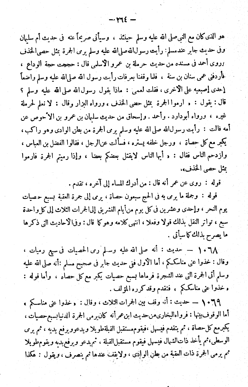 1068 - حديث أنه صلى الله عليه و سلم رمى الحصيات في سبع رميات وقال خذوا عني مناسككم أما الأول ففي حديث جابر في صحيح مسلم أنه صلى الله عليه و سلم أتى الجمرة التي عند الشجرة فرماها بسبع حصيات يكبر مع كل حصاة وأما قوله خذوا عني مناسككم فتقدم وقد كرره المؤلف