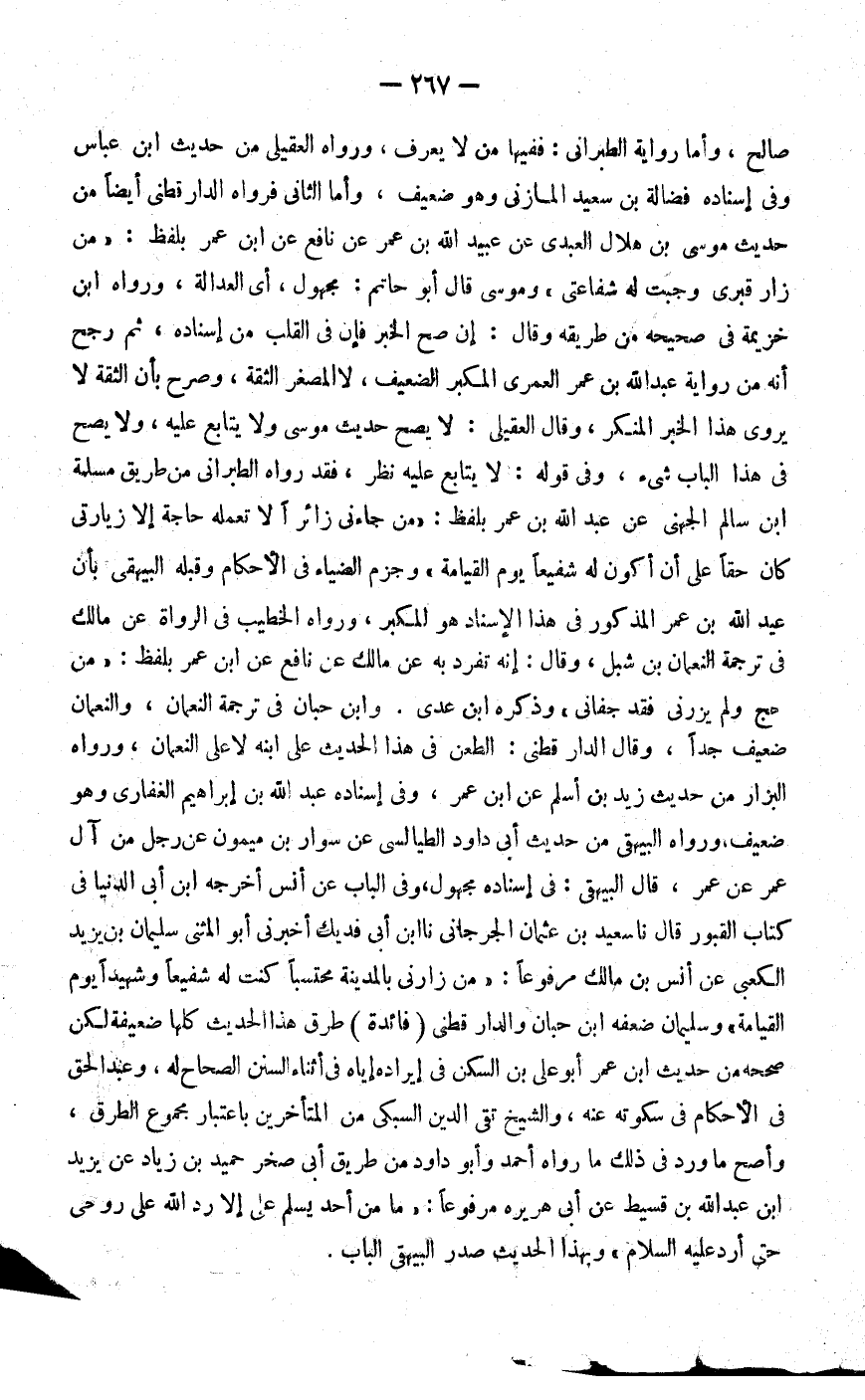 صالح وأما رواية الطبراني ففيها من لا يعرف ورواه العقيلي من حديث بن عباس وفي إسناده فضالة بن سعيد المازني وهو ضعيف وأما الثاني فرواه الدارقطني أيضا من حديث موسى بن هلال العبدي عن عبيد الله بن عمر عن نافع عن بن عمر بلفظ من زار قبري وجبت له شفاعتي وموسى قال أبو حاتم مجهول أي العدالة ورواه بن خزيمة في صحيحه من طريقه وقال إن صح الخبر فإن في القلب من إسناده ثم رجح أنه من رواية عبد الله بن عمر العمري المكبر الضعيف لا المصغر الثقة وصرح بأن الثقة لا يروي هذا الخبر المنكر وقال العقيلي لا يصح حديث موسى ولا يتابع عليه ولا يصح في هذا الباب شيء وفي قوله لا يتابع عليه نظر فقد رواه الطبراني من طريق مسلمة بن سالم الجهني عن عبد الله بن عمر بلفظ من جاءني زائرا لا تعمله حاجة إلا زيارتي كان حقا علي أن أكون له شفيعا يوم القيامة وجزم الضياء في الأحكام وقبله البيهقي بأن عبد الله بن عمر المذكور في هذا الإسناد هو المكبر ورواه الخطيب في الرواة عن مالك في ترجمة النعمان بن شبل وقال إنه تفرد به عن مالك عن نافع عن بن عمر بلفظ من حج ولم يزرني فقد جفاني وذكره بن عدي وابن حبان في ترجمة النعمان والنعمان ضعيف جدا وقال الدارقطني الطعن في هذا الحديث على ابنه لا على النعمان ورواه البزار من حديث زيد بن أسلم عن بن عمر وفي إسناده عبد الله بن إبراهيم الغفاري وهو ضعيف ورواه البيهقي من حديث أبي داود الطيالسي عن سوار بن ميمون عن رجل من آل عمر عن عمر قال البيهقي في إسناده مجهول وفي الباب عن أنس أخرجه بن أبي الدنيا في كتاب القبور قال نا سعيد بن عثمان الجرجاني نا بن أبي فديك أخبرني أبو المثنى سليمان بن يزيد الكعبي عن أنس بن مالك مرفوعا من زارني بالمدينة محتسبا كنت له شفيعا وشهيدا يوم القيامة وسليمان ضعفه بن حبان والدارقطني