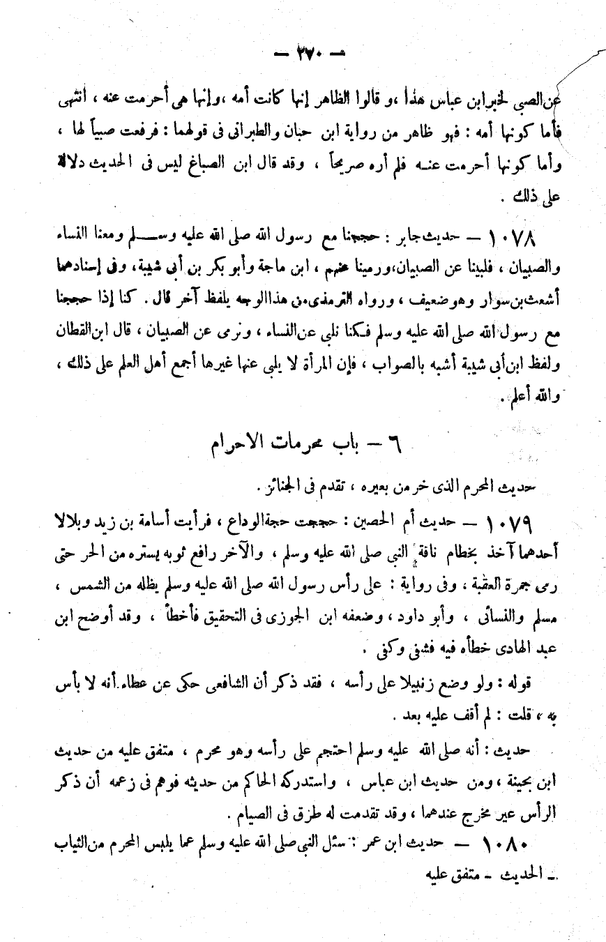 1079 - حديث أم الحصين حججت حجة الوداع فرأيت أسامة بن زيد وبلالا أحدهما آخذ بخطام ناقة النبي صلى الله عليه و سلم والآخر رافع ثوبه يستره من الحر حتى رمى جمرة العقبة وفي رواية على رأس رسول الله صلى الله عليه و سلم يظله من الشمس مسلم والنسائي وأبو داود وضعفه بن الجوزي في التحقيق فأخطأ وقد أوضح بن عبد الهادي خطأه فيه فشفى وكفى