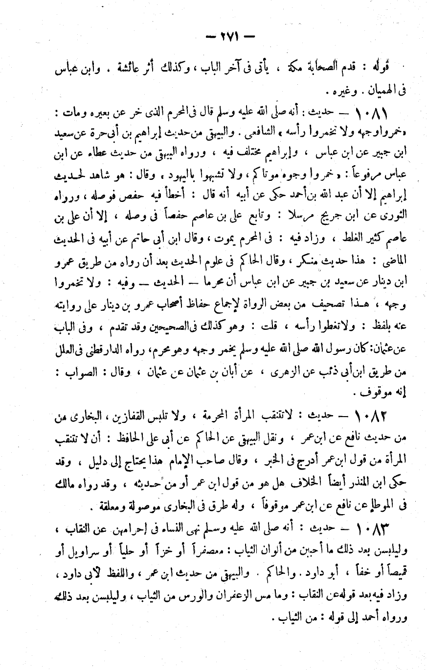 1081 - حديث أنه صلى الله عليه و سلم قال في المحرم الذي خر عن بعيره ومات خمروا وجهه ولا تخمروا رأسه الشافعي والبيهقي من حديث إبراهيم بن أبي حرة عن سعيد بن جبير عن بن عباس وإبراهيم مختلف فيه ورواه البيهقي من حديث عطاء عن بن عباس مرفوعا خمروا وجوه موتاكم ولا تشبهوا باليهود وقال هو شاهد لحديث إبراهيم إلا أن عبد الله بن أحمد حكى عن أبيه أنه قال أخطأ فيه حفص فوصله ورواه الثوري عن بن جريج مرسلا وتابع علي بن عاصم حفصا في وصله إلا أن علي بن عاصم كثير الغلط وزاد فيه في المحرم يموت وقال بن أبي حاتم عن أبيه في الحديث الماضي هذا حديث منكر وقال الحاكم في علوم الحديث بعد أن رواه من طريق عمرو بن دينار عن سعيد بن جبير عن بن عباس أن محرما الحديث وفيه ولا تخمروا وجهه هذا تصحيف من بعض الرواة لإجماع حفاظ أصحاب عمرو بن دينار على روايته عنه بلفظ ولا تغطوا رأسه قلت وهو كذلك في الصحيحين وقد تقدم وفي الباب عن عثمان كان رسول الله صلى الله عليه و سلم يخمر وجهه وهو محرم رواه الدارقطني في العلل من طريق بن أبي ذئب عن الزهري عن أبان بن عثمان عن عثمان وقال الصواب إنه موقوف