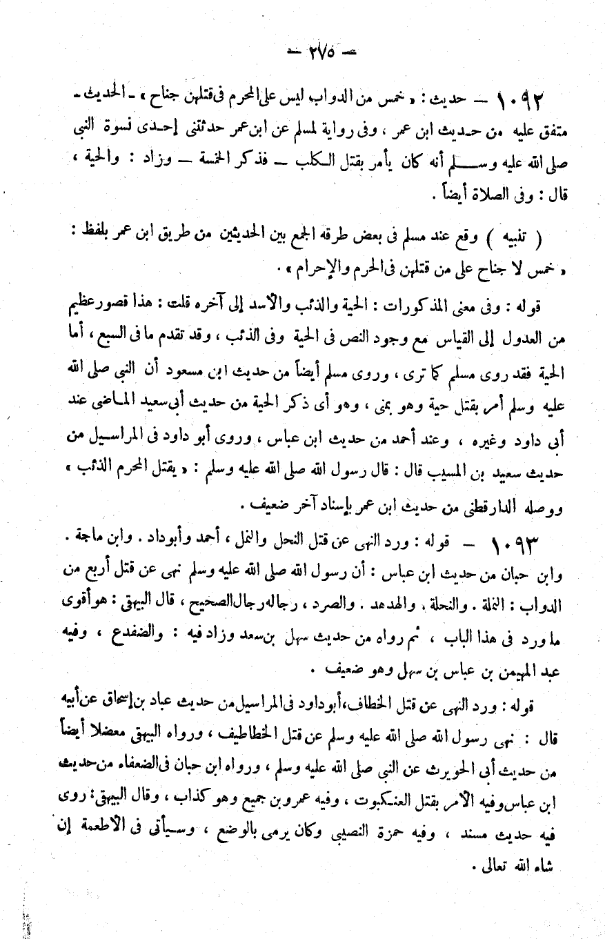 1092 - حديث خمس من الدواب ليس على المحرم في قتلهن جناح الحديث متفق عليه من حديث بن عمر وفي وراية لمسلم عن بن عمر حدثتني إحدى نسوة النبي صلى الله عليه و سلم أنه كان يأمر بقتل الكلب فذكر الخمسة وزاد والحية قال وفي الصلاة أيضا