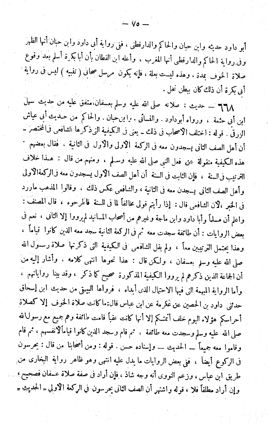 668 - حديث صلاته صلى الله عليه و سلم بعسفان متفق عليه من حديث سهل بن أبي حثمة ورواه أبو داود والنسائي وابن حبان والحاكم من حديث أبي عياش الزرقي قوله اختلف الأصحاب في ذلك يعني في الكيفية التي ذكرها الشافعي في المختصر أن أهل الصف الثاني يسجدون معه في الركعة الأولى والأول في الثانية فقال بعضهم هذه الكيفية منقولة عن فعل النبي صلى الله عليه و سلم ومنهم من قال هذا خلاف الترتيب في السنة فإن الثابت في السنة أن أهل الصف الأول يسجدون معه في الركعة الأولى وأهل الصف الثاني يسجدون معه في الثانية والشافعي عكس ذلك وقالوا المذهب ما ورد في الخبر لأن الشافعي قال إذا رأيتم قولي مخالفا لما في السنة فاطرحوه قال المصنف واعلم أن مسلما وأبا داود وابن ماجة وغيرهم من أصحاب المسانيد لم يرووا إلا الثاني نعم في بعض الروايات أن طائفة سجدت معه ثم في الركعة الثانية سجد معه الذين كانوا قياما وهذا يحتمل الترتيبين معا ولم يقل الشافعي في الكيفية التي ذكرتها صلاة رسول الله صلى الله عليه و سلم بعسفان ولكن قال هذا نحوها انتهى كلامه وأشار إليه من أن الجماعة الذين ذكرهم لم يرووا الكيفية المذكورة صحيح كما ذكر وقد بينا رواياتهم وأما الرواية المبهمة التي فيها الاحتمال الذي أبداه فرواها البيهقي من حديث بن إسحاق حدثني داود بن الحصين عن عكرمة عن بن عباس قال ما كانت صلاة الخوف إلا كصلاة أحراسكم هؤلاء اليوم خلف أئمتكم إلا أنها كانت عقبا قامت طائفة وهم جميع مع رسول الله صلى الله عليه و سلم وسجدت معه طائفة ثم قام وسجد الذين كانوا قياما لأنفسهم ثم قام وقاموا معه جميعا الحديث وإسناده حسن قوله ومن أصحابنا من قال يحرسون في الركوع أيضا ففي بعض الروايات ما يدل عليه انتهى وهو ظاهر رواية البخاري من طريق بن عباس وزعم النووي أنه وجه شاذ فإن أراد في صفة صلاة عسفان فصحيح وإن أراد مطلقا فلا قوله واشتهر أن الصف الثاني يحرسون في الركعة الأولى الحديث