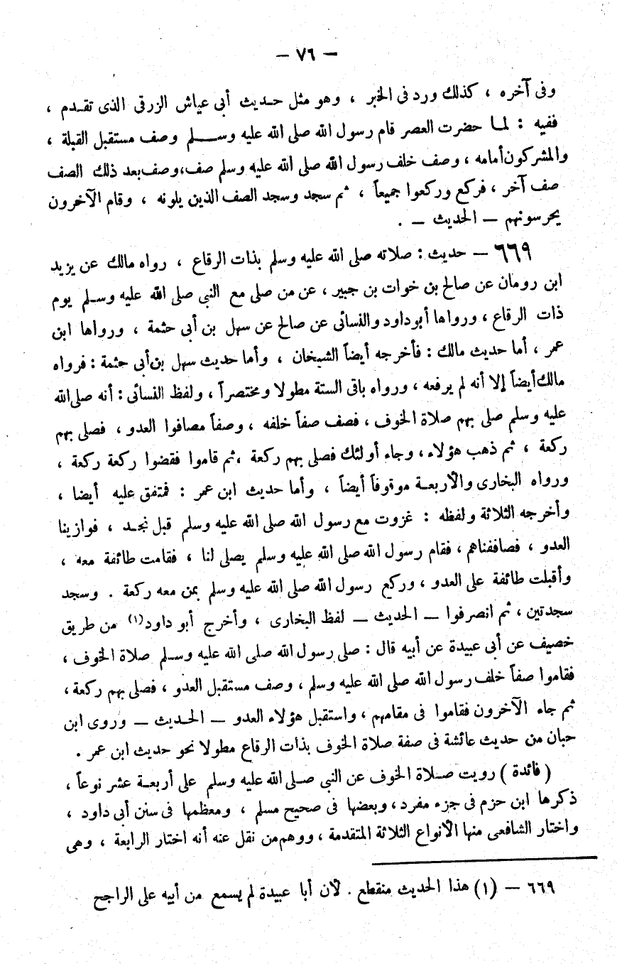 669 - حديث صلاته صلى الله عليه و سلم بذات الرقاع رواه مالك عن يزيد بن رومان عن صالح بن خوات بن جبير عن من صلى مع النبي صلى الله عليه و سلم يوم ذات الرقاع ورواها أبو داود والنسائي عن صالح عن سهل بن أبي حثمة ورواها بن عمر أما حديث مالك فأخرجه أيضا الشيخان وأما حديث سهل بن أبي حثمة فرواه مالك أيضا إلا أنه لم يرفعه ورواه باقي الستة مطولا ومختصرا ولفظ النسائي أنه صلى الله عليه و سلم صلى بهم صلاة الخوف فصف صفا خلفه وصفا مصافوا العدو فصلى بهم ركعة ثم ذهب هؤلاء وجاء أولئك فصلى بهم ركعة ثم قاموا فقضوا ركعة ركعة ورواه البخاري والأربعة موقوفا أيضا وأما حديث بن عمر فمتفق عليه أيضا وأخرجه الثلاثة ولفظه غزوت مع رسول الله صلى الله عليه و سلم قبل نجد فوازينا العدو فصاففناهم فقام رسول الله صلى الله عليه و سلم يصلي لنا فقامت طائفة معه وأقبلت طائفة على العدو وركع رسول الله صلى الله عليه و سلم بمن معه ركعة وسجد سجدتين ثم انصرفوا الحديث لفظ البخاري وأخرج أبو داود 1 من طريق خصيف عن أبي عبيدة عن أبيه قال صلى رسول الله صلى الله عليه و سلم صلاة الخوف فقاموا صفا خلف رسول الله صلى الله عليه و سلم وصف مستقبل العدو فصلى بهم ركعة ثم جاء الآخرون فقاموا في مقامهم واستقبل هؤلاء العدو الحديث وروى بن حبان من حديث عائشة في صفة صلاة الخوف بذات الرقاع مطولا نحو حديث بن عمر