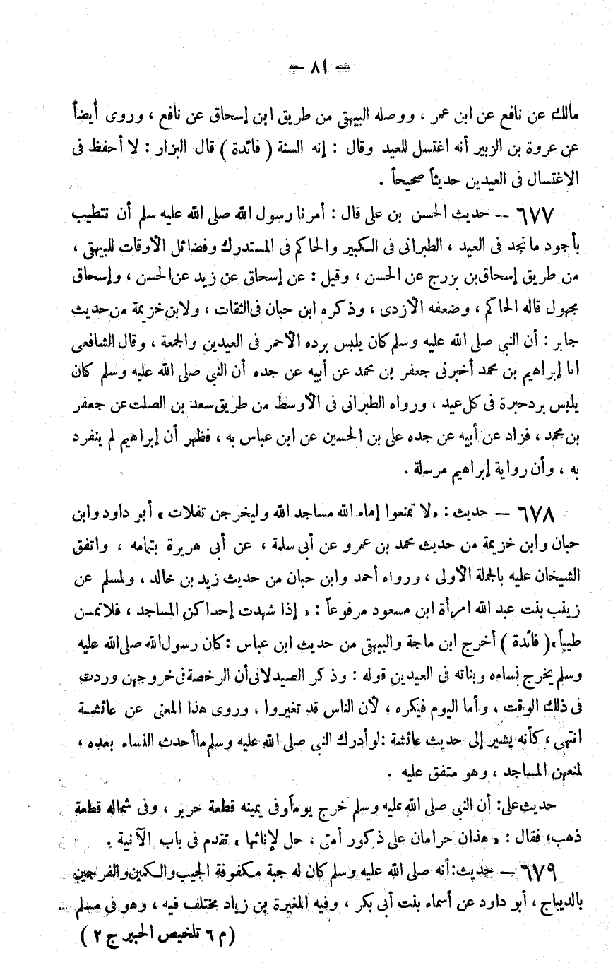 677 - حديث الحسن بن علي قال أمرنا رسول الله صلى الله عليه و سلم أن نتطيب بأجود ما نجد في العيد الطبراني في الكبير والحاكم في المستدرك وفضائل الأوقات للبيهقي من طريق إسحاق بن بزرج عن الحسن وقيل عن إسحاق عن زيد عن الحسن وإسحاق مجهول قاله الحاكم وضعفه الأزدي وذكره بن حبان في الثقات ولابن خزيمة من حديث جابر أن النبي صلى الله عليه و سلم كان يلبس برده الأحمر في العيدين والجمعة وقال الشافعي أنا إبراهيم بن محمد أخبرني جعفر بن محمد عن أبيه عن جده أن النبي صلى الله عليه و سلم كان يلبس برد حبرة في كل عيد ورواه الطبراني في الأوسط من طريق سعد بن الصلت عن جعفر بن محمد فزاد عن أبيه عن جده علي بن الحسين عن بن عباس به فظهر أن إبراهيم لم ينفرد به وأن رواية إبراهيم مرسلة