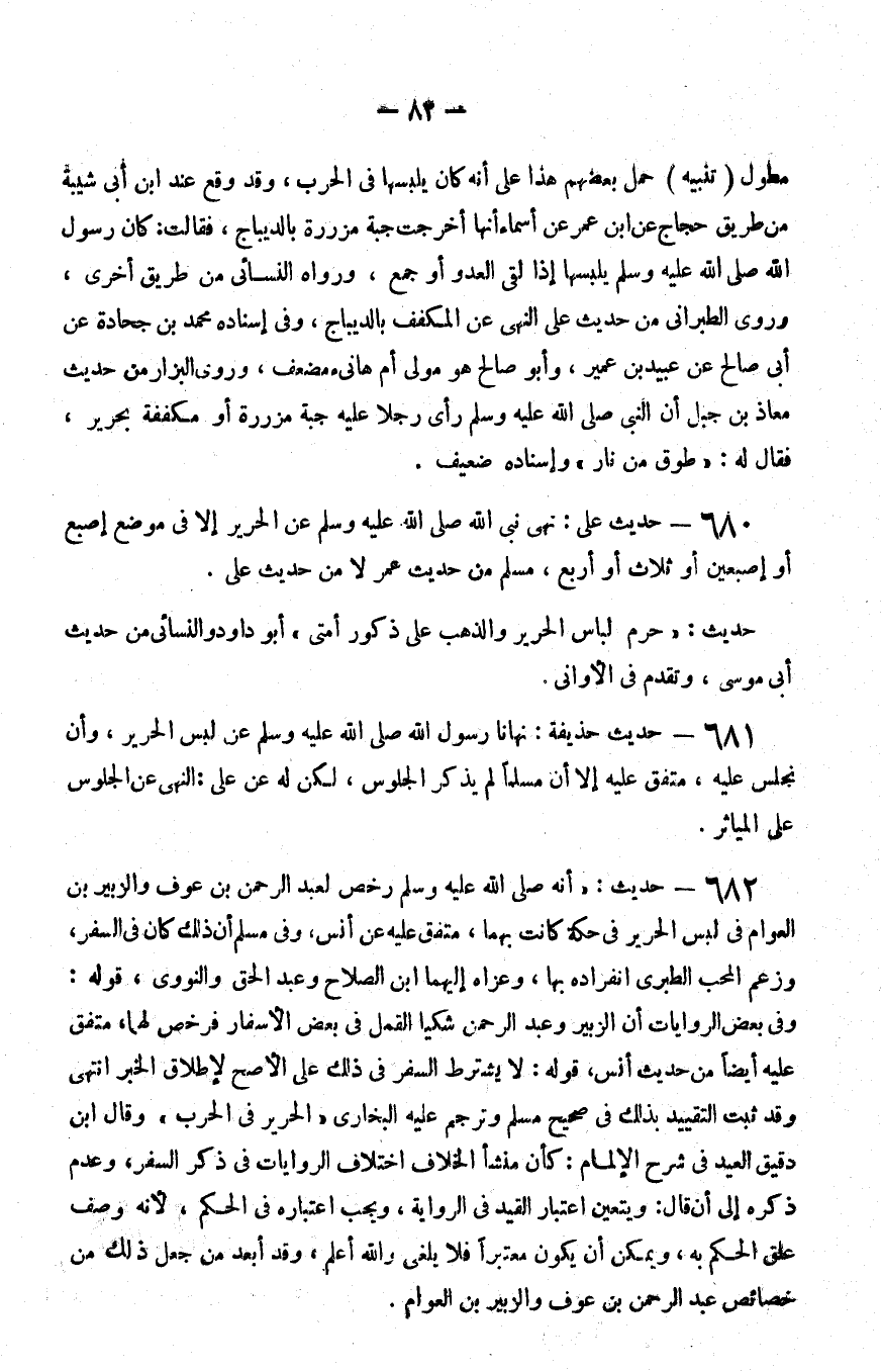 681 - حديث حذيفة نهانا رسول الله صلى الله عليه و سلم عن لبس الحرير وأن نجلس عليه متفق عليه إلا أن مسلما لم يذكر الجلوس لكن له عن علي النهى عن الجلوس على المياثر