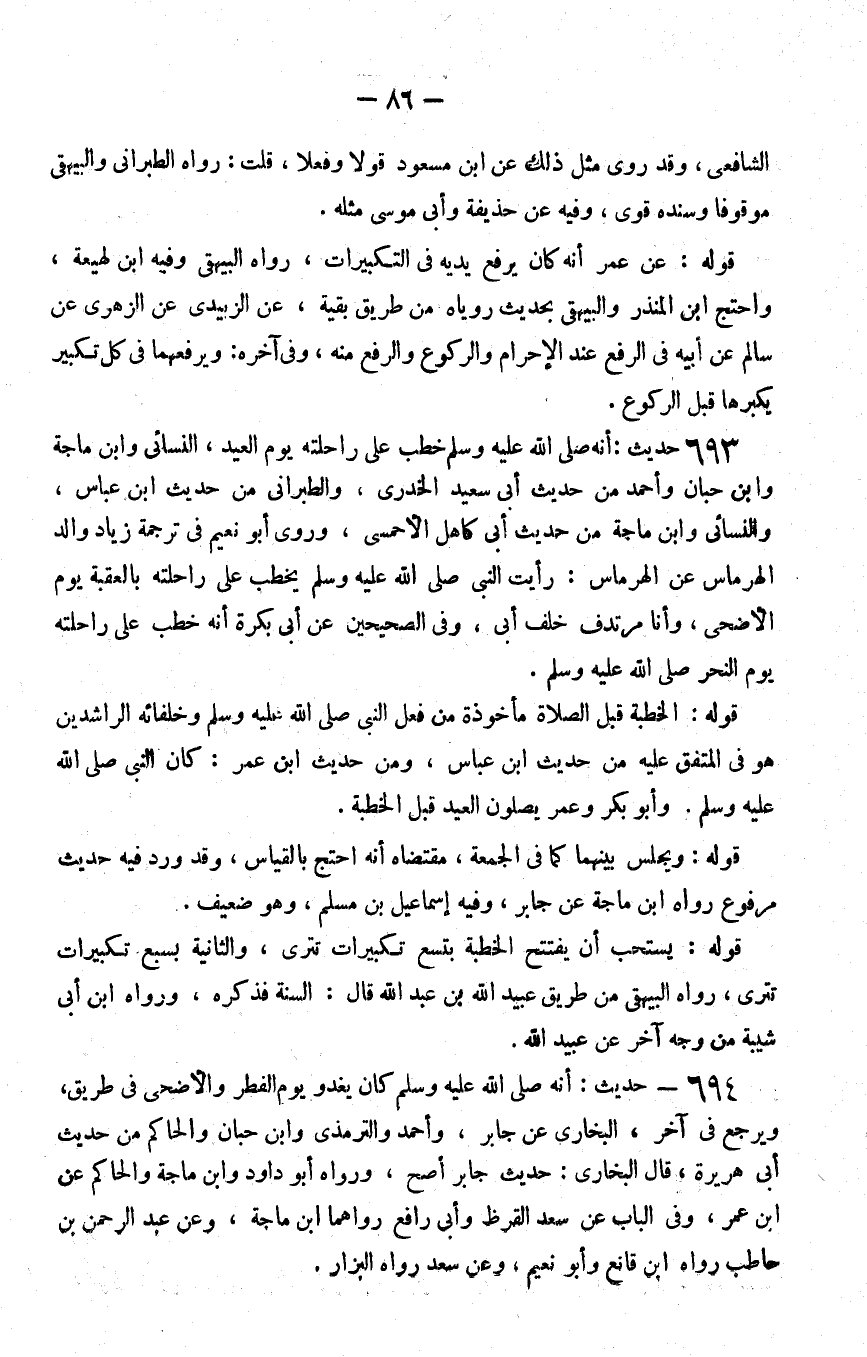 694 - حديث أنه صلى الله عليه و سلم كان يغدو يوم الفطر والأضحى في طريق ويرجع في آخر البخاري عن جابر وأحمد والترمذي وابن حبان والحاكم من حديث أبي هريرة قال البخاري حديث جابر أصح ورواه أبو داود وابن ماجة والحاكم عن بن عمر وفي الباب عن سعد القرظ وأبي رافع رواهما بن ماجة وعن عبد الرحمن بن حاطب رواه بن قانع وأبو نعيم وعن سعد رواه البزار