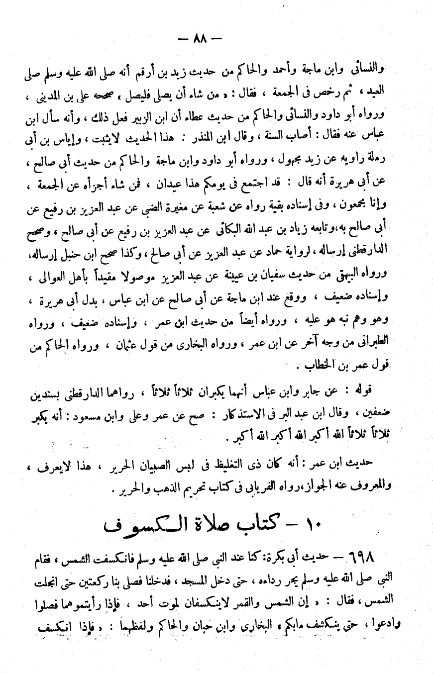 698 - حديث أبي بكرة كنا عند النبي صلى الله عليه و سلم فانكسفت الشمس فقام النبي صلى الله عليه و سلم يجر رداءه حتى دخل المسجد فدخلنا فصلى بنا ركعتين حتى انجلت الشمس فقال إن الشمس والقمر لا ينكسفان لموت أحد فإذا رأيتموهما فصلوا وادعوا حتى ينكشف ما بكم البخاري وابن حبان والحاكم ولفظهما فإذا انكسف
