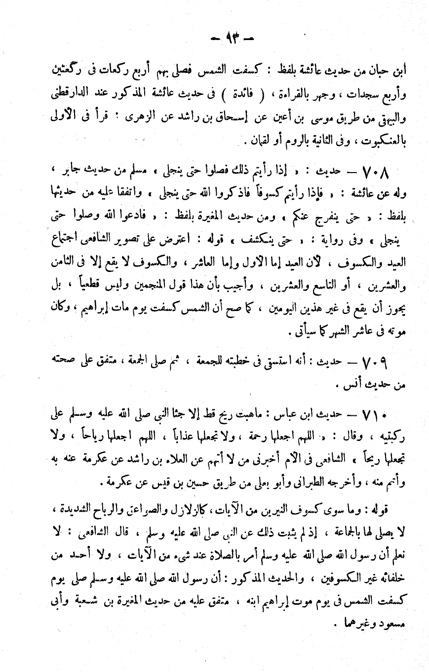 708 - حديث إذا رأيتم ذلك فصلوا حتى ينجلي مسلم من حديث جابر وله عن عائشة فإذا رأيتم كسوفا فاذكروا الله حتى ينجلي واتفقا عليه من حديثها بلفظ حتى ينفرج عنكم ومن حديث المغيرة بلفظ فادعوا الله وصلوا حتى ينجلي وفي رواية حتى ينكشف قوله اعترض على تصوير الشافعي اجتماع العيد والكسوف لأن العيد إما الأول وإما العاشر والكسوف لا يقع إلا في الثامن والعشرين أو التاسع والعشري وأجيب بأن هذا قول المنجمين وليس قطعيا بل يجوز أن يقع في غير هذين اليومين كما صح أن الشمس كسفت يوم مات إبراهيم وكان موته في عاشر الشهر كما سيأتي