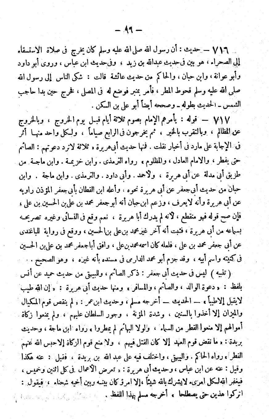 تنبيه ليس في حديث أبي جعفر ذكر الصائم وللبيهقي من حديث حميد عن أنس بلفظ دعوة الوالد والصائم والمسافر ومنها حديث أبي هريرة إن الله طيب لا يقبل إلا طيبا الحديث أخرجه مسلم وحديث بن عمر لم ينقص قوم المكيال والميزان إلا أخذوا بالسنين وشدة المؤنة وجور السلطان عليهم ولم يمنعوا زكاة أموالهم إلا منعوا القطر من السماء ولولا البهائم لم يمطروا رواه بن ماجة وحديث بريدة ما نقض قوم العهد إلا كان القتل فيهم ولا منع قوم الزكاة إلا حبس الله عنهم القطر رواه الحاكم والبيهقي واختلف فيه على عبد الله بن بريدة فقيل عنه هكذا وقيل عنه عن بن عباس وحديث أبي هريرة تعرض الأعمال في كل اثنين وخميس فيغفر الله لكل امرئ لا يشرك بالله شيئا إلا امرؤ كان بينه وبين أخيه شحناء فيقول اتركوا هذين حتى يصطلحا أخرجه مسلم بهذا اللفظ