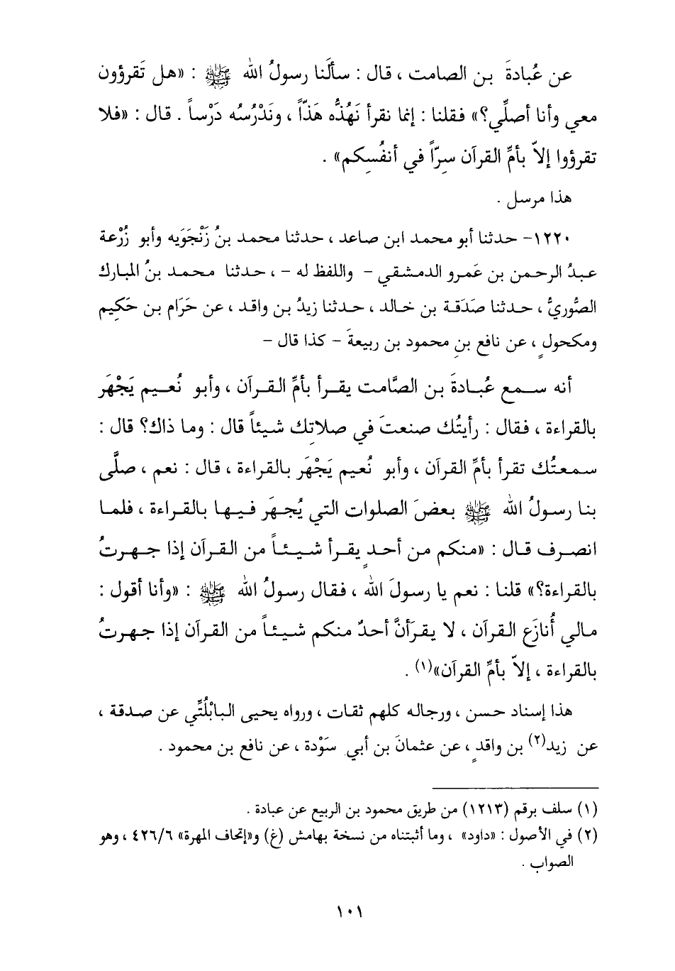 1220 - حَدَّثَنَا أَبُو مُحَمَّدِ بْنُ صَاعِدٍ , ثنا مُحَمَّدُ بْنُ زَنْجُوَيْهِ , وَأَبُو زُرْعَةَ عَبْدُ الرَّحْمَنِ بْنُ عَمْرٍو الدِّمَشْقِيُّ وَاللَّفْظُ لَهُ , قَالَا: نا مُحَمَّدُ بْنُ الْمُبَارَكِ الصُّورِيُّ , ثنا صَدَقَةُ بْنُ خَالِدٍ , ثنا زَيْدُ بْنُ وَاقِدٍ , عَنْ حَرَامِ بْنِ حَكِيمٍ , وَمَكْحُولٍ , عَنْ نَافِعِ بْنِ مَحْمُودِ بْنِ الرَّبِيعِ , كَذَا قَالَ إِنَّهُ سَمِعَ عُبَادَةَ بْنَ الصَّامِتِ , يَقْرَأُ بِأُمِّ الْقُرْآنِ وَأَبُو نُعَيْمٍ يَجْهَرُ بِالْقِرَاءَةِ , فَقُلْتُ: رَأَيْتُكَ صَنَعْتَ فِي صَلَاتِكَ شَيْئًا , قَالَ: وَمَا ذَاكَ؟ , قَالَ: سَمِعْتُكَ تَقْرَأُ بِأُمِّ الْقُرْآنِ وَأَبُو نُعَيْمٍ يَجْهَرُ بِالْقِرَاءَةِ , قَالَ: نَعَمْ صَلَّى بِنَا رَسُولُ اللَّهِ صَلَّى اللهُ عَلَيْهِ وَسَلَّمَ بَعْضَ الصَّلَوَاتِ الَّتِي يُجْهَرُ فِيهَا بِالْقِرَاءَةِ فَلَمَّا انْصَرَفَ , قَالَ: «مِنْكُمْ مِنْ أَحَدٍ يَقْرَأُ شَيْئًا مِنَ الْقُرْآنِ إِذَا جَهَرْتُ بِالْقِرَاءَةِ؟» , قُلْنَا: نَعَمْ يَا رَسُولَ اللَّهِ , فَقَالَ رَسُولُ اللَّهِ صَلَّى اللهُ عَلَيْهِ وَسَلَّمَ: «وَأَنَا أَقُولُ §مَا لِي أُنَازَعُ الْقُرْآنَ فَلَا يَقْرَأَنَّ أَحَدٌ مِنْكُمْ شَيْئًا مِنَ الْقُرْآنِ إِذَا جَهَرْتُ بِالْقِرَاءَةِ إِلَّا بِأُمِّ الْقُرْآنِ». هَذَا إِسْنَادٌ حَسَنٌ وَرِجَالُهُ ثِقَاتٌ كُلُّهُمْ. وَرَوَاهُ يَحْيَى الْبَابَلُتِّيُّ , عَنْ صَدَقَةَ , عَنْ زَيْدِ بْنِ وَاقِدٍ , عَنْ عُثْمَانَ بْنِ أَبِي سَوْدَةَ , عَنْ نَافِعِ بْنِ مَحْمُودٍ. -[102]-