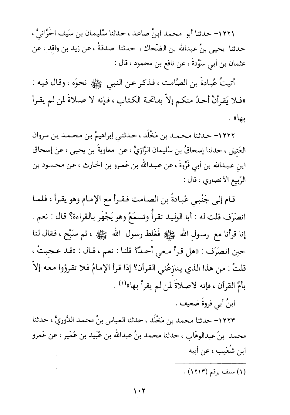 1222 - حَدَّثَنَا مُحَمَّدُ بْنُ مَخْلَدٍ , حَدَّثَنِي إِبْرَاهِيمُ بْنُ مُحَمَّدِ بْنِ مَرْوَانَ الْعَتِيقُ , نا إِسْحَاقُ بْنُ سُلَيْمَانَ الرَّازِيُّ , عَنْ مُعَاوِيَةَ بْنِ يَحْيَى , عَنْ إِسْحَاقَ بْنِ عَبْدِ اللَّهِ بْنِ أَبِي فَرْوَةَ , عَنْ عَبْدِ اللَّهِ بْنِ عَمْرِو بْنِ الْحَارِثِ , عَنْ مَحْمُودِ بْنِ الرَّبِيعِ الْأَنْصَارِيِّ , قَالَ: قَامَ إِلَى جَنْبِي عُبَادَةُ بْنُ الصَّامِتِ فَقَرَأَ مَعَ الْإِمَامِ وَهُوَ يَقْرَأُ فَلَمَّا انْصَرَفَ قُلْتُ لَهُ: أَبَا الْوَلِيدِ تَقْرَأُ وَتَسْمَعُ وَهُوَ يَجْهَرُ بِالْقِرَاءَةِ؟ , قَالَ: نَعَمْ إِنَّا قَرَأْنَا مَعَ رَسُولِ اللَّهِ صَلَّى اللهُ عَلَيْهِ وَسَلَّمَ فَغَلَطَ رَسُولُ اللَّهِ صَلَّى اللهُ عَلَيْهِ وَسَلَّمَ ثُمَّ سَبَّحَ , فَقَالَ لَنَا حِينَ انْصَرَفَ: «هَلْ قَرَأَ مَعِيَ أَحَدٌ؟» , قُلْنَا: نَعَمْ , قَالَ: «قَدْ عَجِبْتُ قُلْتُ مَنْ هَذَا الَّذِي يُنَازِعُنِي الْقُرْآنَ , §إِذَا قَرَأَ الْإِمَامُ فَلَا تَقْرَءُوا مَعَهُ إِلَّا بِأُمِّ الْقُرْآنِ فَإِنَّهُ لَا صَلَاةَ لِمَنْ لَمْ يَقْرَأْ بِهَا». مُعَاوِيَةُ , وَإِسْحَاقُ بْنُ أَبِي فَرْوَةَ ضَعِيفَانِ