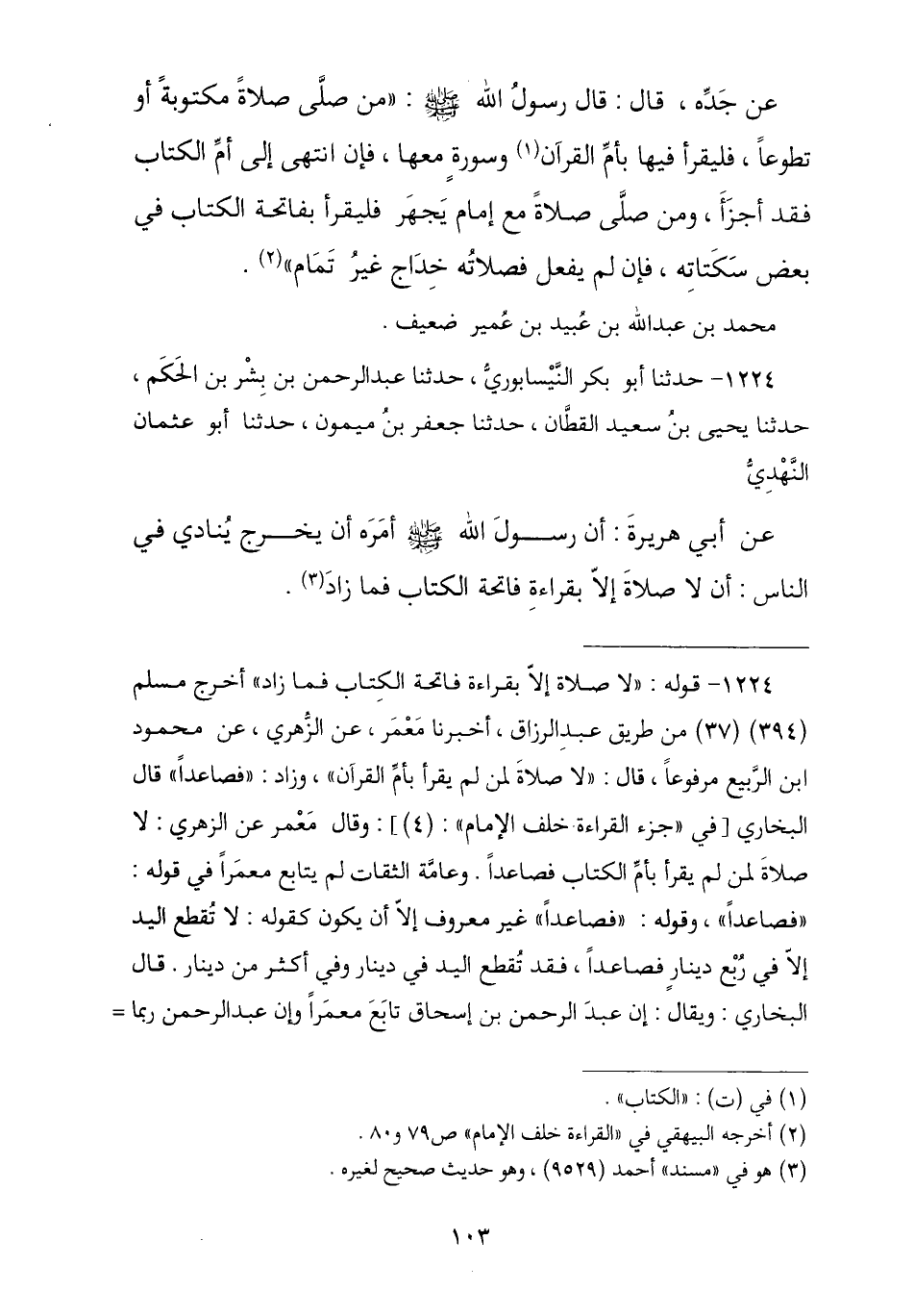 1224 - حَدَّثَنَا أَبُو بَكْرٍ النَّيْسَابُورِيُّ , ثنا عَبْدُ الرَّحْمَنِ بْنُ بِشْرِ بْنِ الْحَكَمِ , ثنا يَحْيَى بْنُ سَعِيدٍ الْقَطَّانُ , ثنا جَعْفَرُ بْنُ مَيْمُونٍ , ثنا أَبُو عُثْمَانَ النَّهْدِيُّ , عَنْ أَبِي هُرَيْرَةَ , أَنَّ رَسُولَ اللَّهِ صَلَّى اللهُ عَلَيْهِ وَسَلَّمَ «أَمَرَهُ أَنْ يَخْرُجَ يُنَادِي فِي النَّاسِ أَنْ §لَا صَلَاةَ إِلَّا بِقِرَاءَةِ فَاتِحَةِ الْكِتَابِ فَمَا زَادَ»