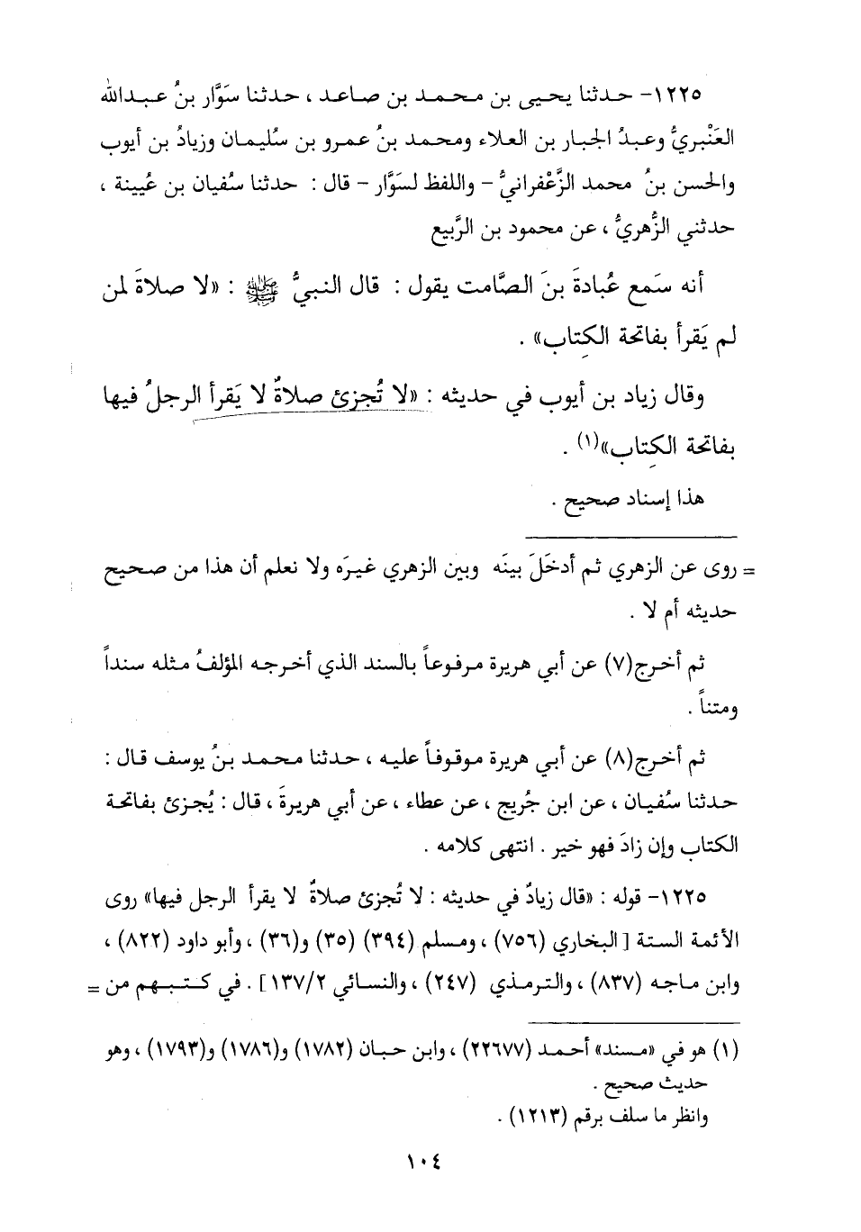 1225 - حَدَّثَنَا يَحْيَى بْنُ مُحَمَّدِ بْنِ صَاعِدٍ , ثنا سَوَّارُ بْنُ عَبْدِ اللَّهِ الْعَنْبَرِيُّ , وَعَبْدُ الْجَبَّارِ بْنُ الْعَلَاءِ , وَمُحَمَّدُ بْنُ عَمْرِو بْنِ سُلَيْمَانَ , وَزِيَادُ بْنُ أَيُّوبَ , وَالْحَسَنُ بْنُ مُحَمَّدٍ الزَّعْفَرَانِيُّ وَاللَّفْظُ لِسَوَّارٍ , قَالُوا: ثنا سُفْيَانُ بْنُ عُيَيْنَةَ , ثنا الزُّهْرِيُّ , عَنْ مَحْمُودِ بْنِ الرَّبِيعِ , أَنَّهُ سَمِعَ عُبَادَةَ بْنَ الصَّامِتِ , يَقُولُ: قَالَ النَّبِيُّ صَلَّى اللهُ عَلَيْهِ وَسَلَّمَ: § «لَا صَلَاةَ لِمَنْ لَمْ يَقْرَأْ بِفَاتِحَةِ الْكِتَابِ». قَالَ زِيَادٌ فِي حَدِيثِهِ: لَا تُجْزِئُ صَلَاةٌ لَا يَقْرَأُ الرَّجُلُ فِيهَا بِفَاتِحَةِ الْكِتَابِ , هَذَا إِسْنَادٌ صَحِيحٌ