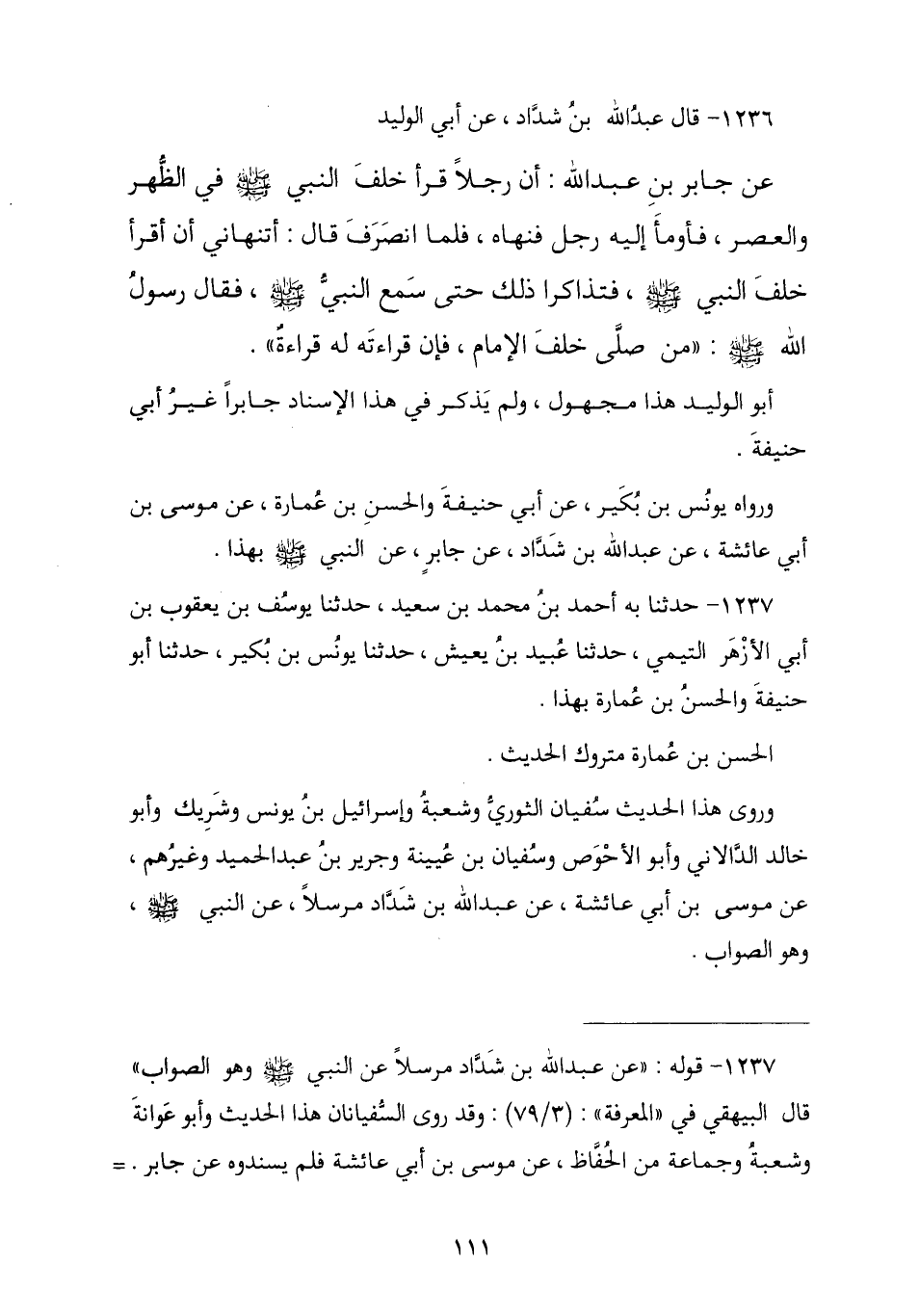 1236 - وَقَالَ عَبْدُ اللَّهِ بْنُ شَدَّادٍ , عَنْ أَبِي الْوَلِيدِ , عَنْ جَابِرِ بْنِ عَبْدِ اللَّهِ , أَنَّ رَجُلًا قَرَأَ خَلْفَ النَّبِيِّ صَلَّى اللهُ عَلَيْهِ وَسَلَّمَ فِي الظُّهْرِ وَالْعَصْرِ فَأَوْمَأَ إِلَيْهِ رَجُلٌ فَنَهَاهُ , فَلَمَّا انْصَرَفَ قَالَ: أَتَنْهَانِي أَنْ أَقْرَأَ خَلْفَ النَّبِيِّ صَلَّى اللهُ عَلَيْهِ وَسَلَّمَ؟ , فَتَذَاكَرَا ذَلِكَ حَتَّى سَمِعَ النَّبِيُّ صَلَّى اللهُ عَلَيْهِ وَسَلَّمَ فَقَالَ رَسُولُ اللَّهِ صَلَّى اللهُ عَلَيْهِ وَسَلَّمَ: § «مَنْ صَلَّى خَلْفَ الْإِمَامِ فَإِنَّ قِرَاءَتَهُ لَهُ قِرَاءَةٌ». أَبُو الْوَلِيدِ هَذَا مَجْهُولٌ , وَلَمْ يَذْكُرْ فِي هَذَا الْإِسْنَادِ جَابِرًا غَيْرُ أَبِي حَنِيفَةَ وَرَوَاهُ يُونُسُ بْنُ بُكَيْرٍ , عَنْ أَبِي حَنِيفَةَ , وَالْحَسَنِ بْنِ عُمَارَةَ , عَنْ مُوسَى بْنِ أَبِي عَائِشَةَ , عَنْ عَبْدِ اللَّهِ بْنِ شَدَّادٍ , عَنْ جَابِرٍ , عَنِ النَّبِيِّ صَلَّى اللهُ عَلَيْهِ وَسَلَّمَ بِهَذَا.