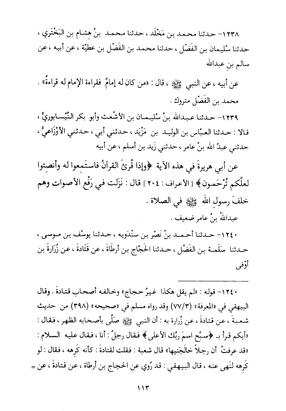 1240 - حَدَّثَنَا أَحْمَدُ بْنُ نَصْرِ بْنِ سَنْدَوَيْهِ , ثنا يُوسُفُ بْنُ مُوسَى , ثنا سَلَمَةُ بْنُ الْفَضْلِ , ثنا الْحَجَّاجُ بْنُ أَرْطَأَةَ , عَنْ قَتَادَةَ , عَنْ زُرَارَةَ بْنِ أَوْفَى , -[114]- عَنْ عِمْرَانَ بْنِ حُصَيْنٍ , قَالَ: كَانَ النَّبِيُّ صَلَّى اللهُ عَلَيْهِ وَسَلَّمَ يُصَلِّي بِالنَّاسِ وَرَجُلٌ يَقْرَأُ خَلْفَهُ فَلَمَّا فَرَغَ قَالَ: § «مَنْ ذَا الَّذِي يُخَالِجُنِي سُورَتَهُمْ» , فَنَهَاهُمْ عَنِ الْقِرَاءَةِ خَلْفَ الْإِمَامِ. وَلَمْ يَقُلْ هَكَذَا غَيْرُ حَجَّاجٍ , وَخَالَفَهُ أَصْحَابُ قَتَادَةَ , مِنْهُمْ: شُعْبَةُ , وَسَعِيدٌ وَغَيْرُهُمَا , فَلَمْ يَذْكُرُوا أَنَّهُ نَهَاهُمْ عَنِ الْقِرَاءَةِ , وَحَجَّاجٌ لَا يُحْتَجُّ بِهِ