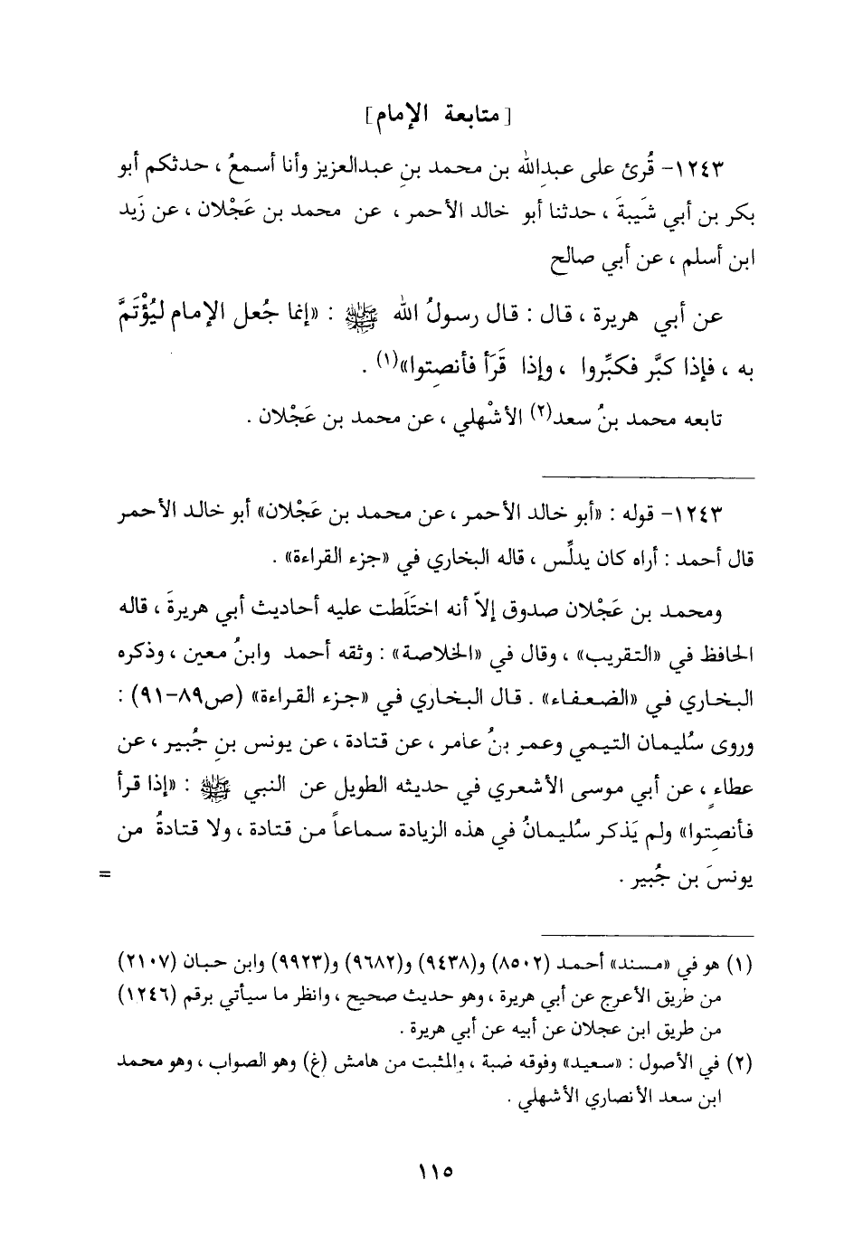 1243 - قُرِئَ عَلَى عَبْدِ اللَّهِ بْنِ مُحَمَّدِ بْنِ عَبْدِ الْعَزِيزِ وَأَنَا أَسْمَعُ: حَدَّثَكُمْ أَبُو بَكْرِ بْنُ أَبِي شَيْبَةَ , ثنا أَبُو خَالِدٍ الْأَحْمَرُ , عَنْ مُحَمَّدِ بْنِ عَجْلَانَ , عَنْ زَيْدِ بْنِ أَسْلَمَ , عَنْ أَبِي صَالِحٍ , عَنْ أَبِي هُرَيْرَةَ , قَالَ: قَالَ رَسُولُ اللَّهِ صَلَّى اللهُ عَلَيْهِ وَسَلَّمَ: «إِنَّمَا جُعِلَ الْإِمَامُ لِيُؤْتَمَّ بِهِ §فَإِذَا كَبَّرَ فَكَبِّرُوا , وَإِذَا قَرَأَ فَأَنْصِتُوا». تَابَعَهُ مُحَمَّدُ بْنُ سَعْدٍ الْأَشْهَلِيُّ