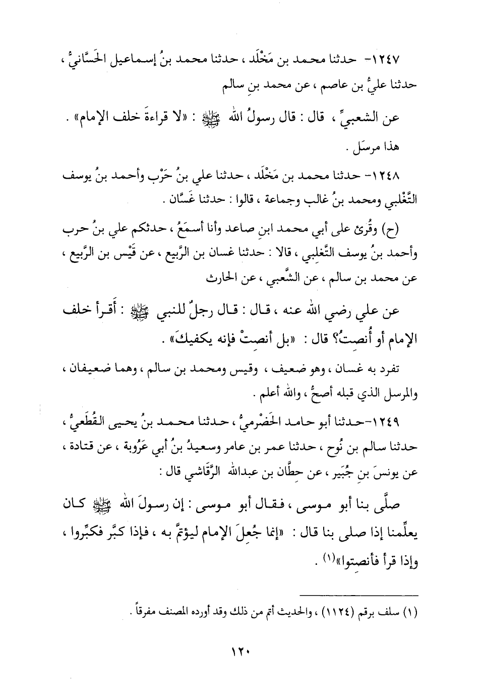 1247 - حَدَّثَنَا مُحَمَّدُ بْنُ مَخْلَدٍ , ثنا مُحَمَّدُ بْنُ إِسْمَاعِيلَ الْحَسَّانِيُّ , ثنا عَلِيُّ بْنُ عَاصِمٍ , عَنْ مُحَمَّدِ بْنِ سَالِمٍ , عَنِ الشَّعْبِيِّ , قَالَ: قَالَ رَسُولُ اللَّهِ صَلَّى اللهُ عَلَيْهِ وَسَلَّمَ: § «لَا قِرَاءَةَ خَلْفَ الْإِمَامِ». هَذَا مُرْسَلٌ