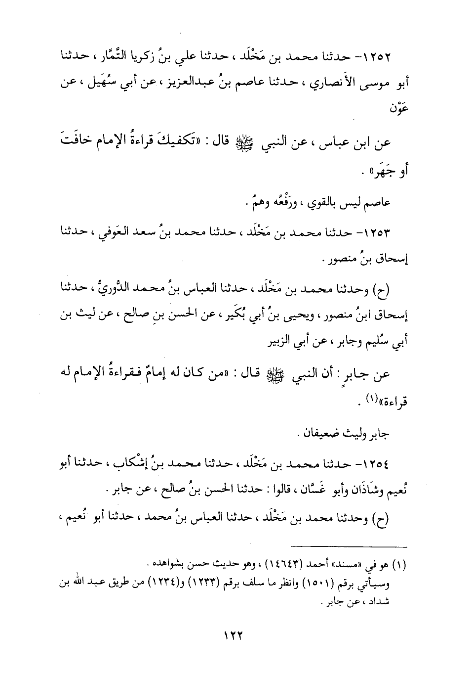 1253 - حَدَّثَنَا مُحَمَّدُ بْنُ مَخْلَدٍ , ثنا مُحَمَّدُ بْنُ سَعْدٍ الْعَوْفِيُّ , ثنا إِسْحَاقُ بْنُ مَنْصُورٍ ح وَحَدَّثَنَا مُحَمَّدُ بْنُ مَخْلَدٍ , ثنا الْعَبَّاسُ بْنُ مُحَمَّدِ بْنِ حَاتِمٍ الدُّورِيُّ , ثنا إِسْحَاقُ بْنُ مَنْصُورٍ , وَيَحْيَى بْنُ أَبِي بُكَيْرٍ , عَنِ الْحَسَنِ بْنِ صَالِحٍ , عَنْ لَيْثِ بْنِ أَبِي سُلَيْمٍ , وَجَابِرٍ , عَنْ أَبِي الزُّبَيْرِ , عَنْ جَابِرٍ , أَنَّ النَّبِيَّ صَلَّى اللهُ عَلَيْهِ وَسَلَّمَ , قَالَ: § «مَنْ كَانَ لَهُ إِمَامٌ فَقِرَاءَتُهُ لَهُ قِرَاءَةٌ». جَابِرٌ , وَلَيْثٌ ضَعِيفَانِ
