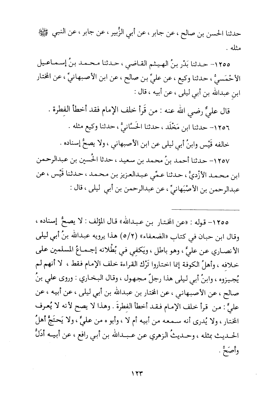 1255 - حَدَّثَنَا بَدْرُ بْنُ الْهَيْثَمِ الْقَاضِي , ثنا مُحَمَّدُ بْنُ إِسْمَاعِيلَ الْأَحْمَسِيُّ , ثنا وَكِيعٌ , عَنْ عَلِيِّ بْنِ صَالِحٍ , عَنِ ابْنِ الْأَصْبَهَانِيِّ , عَنِ الْمُخْتَارِ بْنِ عَبْدِ اللَّهِ بْنِ أَبِي لَيْلَى , عَنْ أَبِيهِ , قَالَ: قَالَ عَلِيٌّ رَضِيَ اللَّهُ عَنْهُ: § «مَنْ قَرَأَ خَلْفَ الْإِمَامِ فَقَدْ أَخْطَأَ الْفِطْرَةَ».