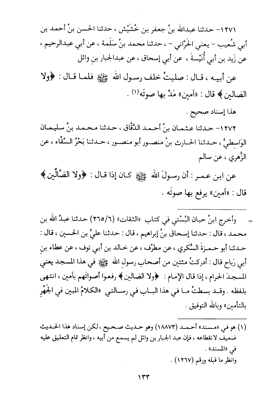 1271 - حَدَّثَنَا عَبْدُ اللَّهِ بْنُ جَعْفَرِ بْنِ خُشَيْشٍ , ثنا الْحَسَنُ بْنُ أَحْمَدَ بْنِ أَبِي شُعَيْبٍ , ثنا مُحَمَّدُ بْنُ سَلَمَةَ , عَنْ أَبِي عَبْدِ الرَّحِيمِ , عَنْ زَيْدِ بْنِ أَبِي أُنَيْسَةَ , عَنْ أَبِي إِسْحَاقَ , عَنْ عَبْدِ الْجَبَّارِ بْنِ وَائِلٍ , عَنْ أَبِيهِ , قَالَ: صَلَّيْتُ خَلْفَ رَسُولِ اللَّهِ صَلَّى اللهُ عَلَيْهِ وَسَلَّمَ قَالَ: فَلَمَّا قَالَ: " {وَلَا الضَّالِّينَ} [الفاتحة: 7] " , قَالَ: § «آمِينَ» مَدَّ بِهَا صَوْتَهُ. هَذَا إِسْنَادٌ صَحِيحٌ