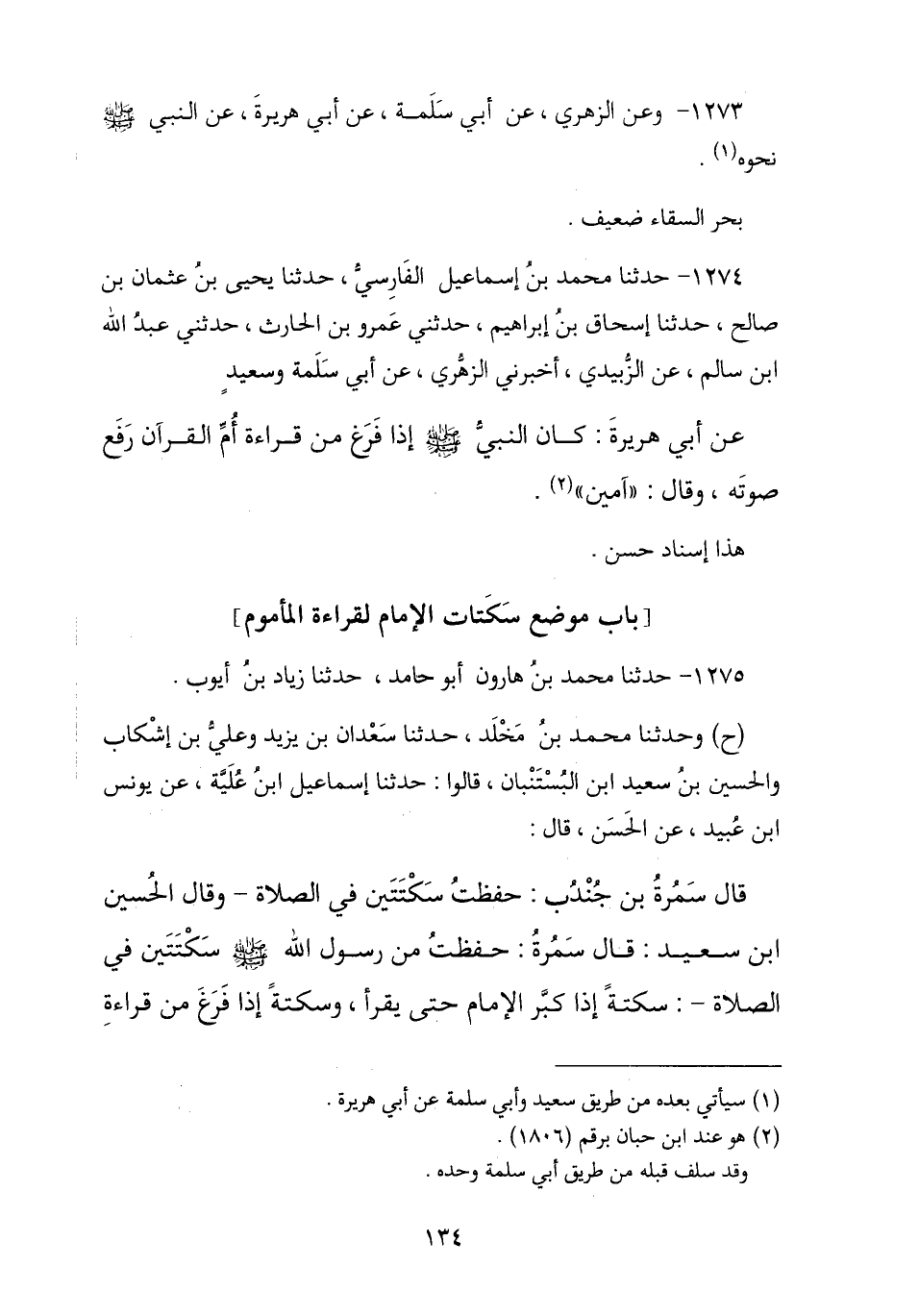 1275 - حَدَّثَنَا أَبُو حَامِدٍ مُحَمَّدُ بْنُ هَارُونَ ثنا زِيَادُ بْنُ أَيُّوبَ , ح وَحَدَّثَنَا مُحَمَّدُ بْنُ مَخْلَدٍ , ثنا سَعْدَانُ بْنُ يَزِيدَ , وَعَلِيُّ بْنُ أَشْكَابٍ , وَالْحُسَيْنُ بْنُ سَعِيدِ بْنِ الْبُسْتَنْبَانِ , قَالُوا: نا إِسْمَاعِيلُ ابْنُ عُلَيَّةَ , عَنْ يُونُسَ بْنِ عُبَيْدٍ , عَنِ الْحَسَنِ , قَالَ: قَالَ سَمُرَةُ بْنُ جُنْدُبٍ: حَفِظْتُ سَكْتَتَيْنِ مِنْ رَسُولِ اللَّهِ صَلَّى اللهُ عَلَيْهِ وَسَلَّمَ فِي الصَّلَاةِ , - وَقَالَ الْحُسَيْنُ بْنُ سَعِيدٍ: - قَالَ سَمُرَةُ: " حَفِظْتُ مِنْ رَسُولِ اللَّهِ صَلَّى اللهُ عَلَيْهِ وَسَلَّمَ §سَكْتَتَيْنِ فِي الصَّلَاةِ: سَكْتَةٌ إِذَا كَبَّرَ الْإِمَامُ حَتَّى يَقْرَأَ , وَسَكْتَةٌ إِذَا فَرَغَ مِنْ قِرَاءَةِ -[135]- فَاتِحَةِ الْكِتَابِ ". فَأَنْكَرَ ذَلِكَ عِمْرَانُ بْنُ حُصَيْنٍ , فَكَتَبُوا إِلَى الْمَدِينَةِ إِلَى أُبَيِّ بْنِ كَعْبٍ , فَصَدَّقَ سَمُرَةَ الْحَسَنُ مُخْتَلِفٌ فِي سَمَاعِهِ مِنْ سَمُرَةَ , وَقَدْ سَمِعَ مِنْهُ حَدِيثًا وَاحِدًا وَهُوَ حَدِيثُ الْعَقِيقَةِ فِيمَا زَعَمَ قُرَيْشُ بْنُ أَنَسٍ , عَنْ حَبِيبِ بْنِ الشَّهِيدِ