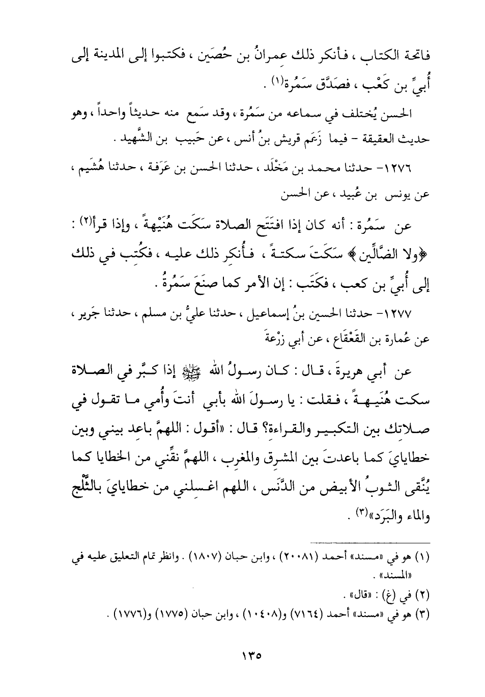 1276 - حَدَّثَنَا مُحَمَّدُ بْنُ مَخْلَدٍ , ثنا الْحَسَنُ بْنُ عَرَفَةَ , ثنا هُشَيْمٌ , عَنْ يُونُسَ بْنِ عُبَيْدٍ , عَنِ الْحَسَنِ , عَنْ سَمُرَةَ " أَنَّهُ كَانَ §إِذَا افْتَتَحَ الصَّلَاةَ سَكَتَ هُنَيْهَةً , وَإِذَا قَرَأَ {وَلَا الضَّالِّينَ} [الفاتحة: 7] , سَكَتَ سَكْتَةً ". فَأُنْكِرَ ذَلِكَ عَلَيْهِ فَكَتَبَ فِي ذَلِكَ إِلَى أُبَيِّ بْنِ كَعْبٍ , فَكَتَبَ: أَنَّ الْأَمْرَ كَمَا صَنَعَ سَمُرَةُ