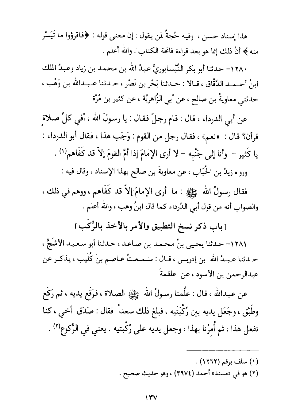1280 - حَدَّثَنَا أَبُو بَكْرٍ النَّيْسَابُورِيُّ عَبْدُ اللَّهِ بْنُ مُحَمَّدِ بْنِ زِيَادٍ , وَعَبْدُ الْمَلِكِ بْنُ أَحْمَدَ الدَّقَّاقُ , قَالَا: نا بَحْرُ بْنُ نَصْرٍ , ثنا عَبْدُ اللَّهِ بْنُ وَهْبٍ , حَدَّثَنِي مُعَاوِيَةُ بْنُ صَالِحٍ , عَنْ أَبِي الزَّاهِرِيَّةِ , عَنْ كَثِيرِ بْنِ مُرَّةَ , عَنْ أَبِي الدَّرْدَاءِ , قَالَ: قَامَ رَجُلٌ فَقَالَ: يَا رَسُولَ اللَّهِ §أَفِي كُلِّ صَلَاةٍ قُرْآنٌ؟ , قَالَ: «نَعَمْ». فَقَالَ رَجُلٌ مِنَ الْقَوْمِ: وَجَبَ هَذَا , فَقَالَ أَبُو الدَّرْدَاءِ: يَا كَثِيرُ وَأَنَا إِلَى جَنْبِهِ لَا أَرَى الْإِمَامَ إِذَا أَمَّ الْقَوْمَ إِلَّا قَدْ كَفَاهُمْ. وَرَوَاهُ زَيْدُ بْنُ حُبَابٍ , عَنْ مُعَاوِيَةَ بْنِ صَالِحٍ بِهَذَا الْإِسْنَادِ وَقَالَ فِيهِ: فَقَالَ رَسُولُ اللَّهِ صَلَّى اللهُ عَلَيْهِ وَسَلَّمَ: «مَا أَرَى الْإِمَامَ إِلَّا قَدْ كَفَاهُمْ». وَوَهِمَ فِيهِ وَالصَّوَابُ أَنَّهُ مِنْ قَوْلِ أَبِي الدَّرْدَاءِ كَمَا قَالَ ابْنُ وَهْبٍ وَاللَّهُ أَعْلَمُ