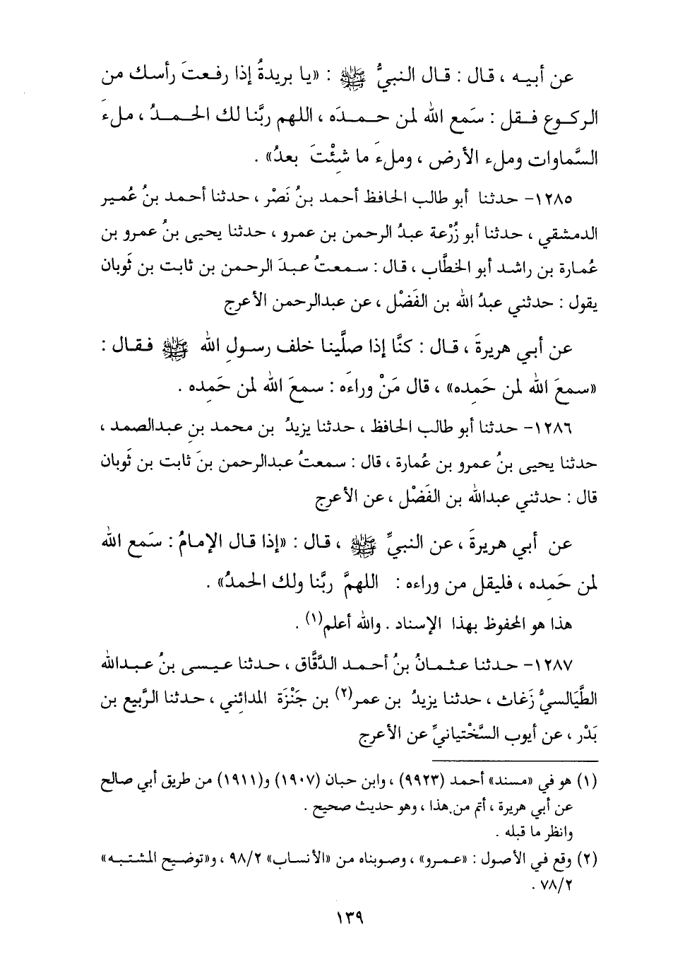 1285 - حَدَّثَنَا أَبُو طَالِبٍ الْحَافِظُ أَحْمَدُ بْنُ نَصْرٍ , نا أَحْمَدُ بْنُ عُمَيْرٍ الدِّمَشْقِيُّ , ثنا أَبُو زُرْعَةَ عَبْدُ الرَّحْمَنِ بْنُ عَمْرٍو , حَدَّثَنَا يَحْيَى بْنُ عَمْرِو بْنِ عُمَارَةَ بْنِ رَاشِدٍ أَبُو الْخَطَّابِ , قَالَ: سَمِعْتُ عَبْدَ الرَّحْمَنِ بْنَ ثَابِتِ بْنِ ثَوْبَانَ , يَقُولُ: حَدَّثَنِي عَبْدُ اللَّهِ بْنُ الْفَضْلِ , عَنِ الْأَعْرَجِ , عَنْ أَبِي هُرَيْرَةَ , أَنَّ النَّبِيَّ صَلَّى اللهُ عَلَيْهِ وَسَلَّمَ , قَالَ: " §إِذَا قَالَ الْإِمَامُ: سَمِعَ اللَّهُ لِمَنْ حَمِدَهُ , فَلْيَقُلْ مَنْ وَرَاءَهُ: سَمِعَ اللَّهُ لِمَنْ حَمِدَهُ "