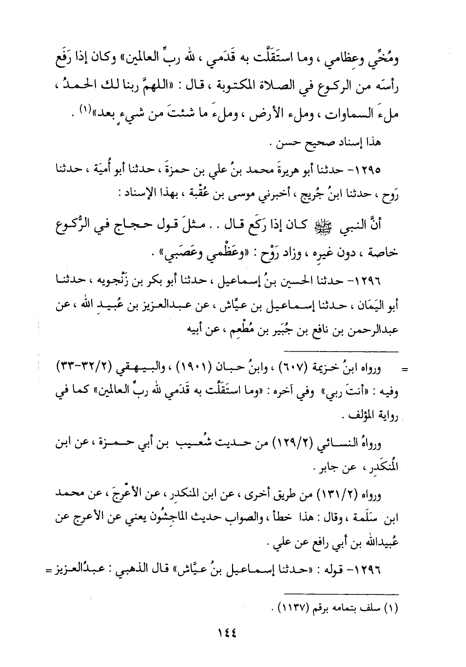 1296 - حَدَّثَنَا الْحُسَيْنُ بْنُ إِسْمَاعِيلَ , ثنا أَبُو بَكْرِ بْنُ زَنْجُوَيْهِ , نا أَبُو الْيَمَانِ , ثنا إِسْمَاعِيلُ بْنُ عَيَّاشٍ , عَنْ عَبْدِ الْعَزِيزِ بْنِ عُبَيْدِ اللَّهِ , عَنْ عَبْدِ الرَّحْمَنِ بْنِ نَافِعِ بْنِ جُبَيْرِ بْنِ مُطْعِمٍ , عَنْ أَبِيهِ , -[145]- عَنْ جَدِّهِ , قَالَ: كَانَ رَسُولُ اللَّهِ صَلَّى اللهُ عَلَيْهِ وَسَلَّمَ §يَقُولُ إِذَا رَكَعَ: «سُبْحَانَ رَبِّيَ الْعَظِيمِ» ثَلَاثَ مَرَّاتٍ