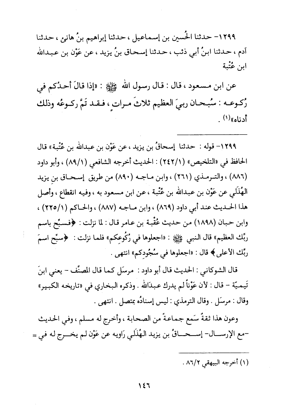 1299 - حَدَّثَنَا الْحُسَيْنُ بْنُ إِسْمَاعِيلَ , ثنا إِبْرَاهِيمُ بْنُ هَانِئٍ , ثنا آدَمُ , ثنا ابْنُ أَبِي ذِئْبٍ , ثنا إِسْحَاقُ بْنُ يَزِيدَ , عَنْ عَوْنِ بْنِ عَبْدِ اللَّهِ بْنِ عُتْبَةَ , عَنِ ابْنِ مَسْعُودٍ , قَالَ: قَالَ رَسُولُ اللَّهِ صَلَّى اللهُ عَلَيْهِ وَسَلَّمَ: " §إِذَا قَالَ أَحَدُكُمْ فِي رُكُوعِهِ: سُبْحَانَ رَبِّيَ الْعَظِيمِ ثَلَاثَ مَرَّاتٍ فَقَدْ تَمَّ رُكُوعُهُ وَذَلِكَ أَدْنَاهُ "