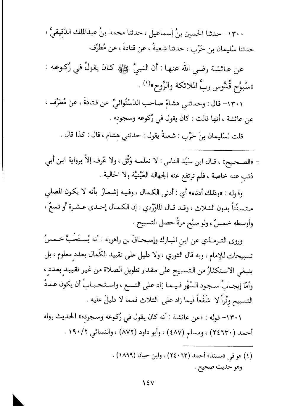 1300 - حَدَّثَنَا الْحُسَيْنُ بْنُ إِسْمَاعِيلَ , ثنا مُحَمَّدُ بْنُ عَبْدِ الْمَلِكِ الدَّقِيقِيُّ , ثنا سُلَيْمَانُ بْنُ حَرْبٍ , ثنا شُعْبَةُ , عَنْ قَتَادَةَ , عَنْ مُطَرِّفٍ , عَنْ عَائِشَةَ , أَنَّ النَّبِيَّ صَلَّى اللهُ عَلَيْهِ وَسَلَّمَ كَانَ §يَقُولُ فِي رُكُوعِهِ: «سُبُّوحٌ قُدُّوسٌ رَبُّ الْمَلَائِكَةِ وَالرُّوحِ».