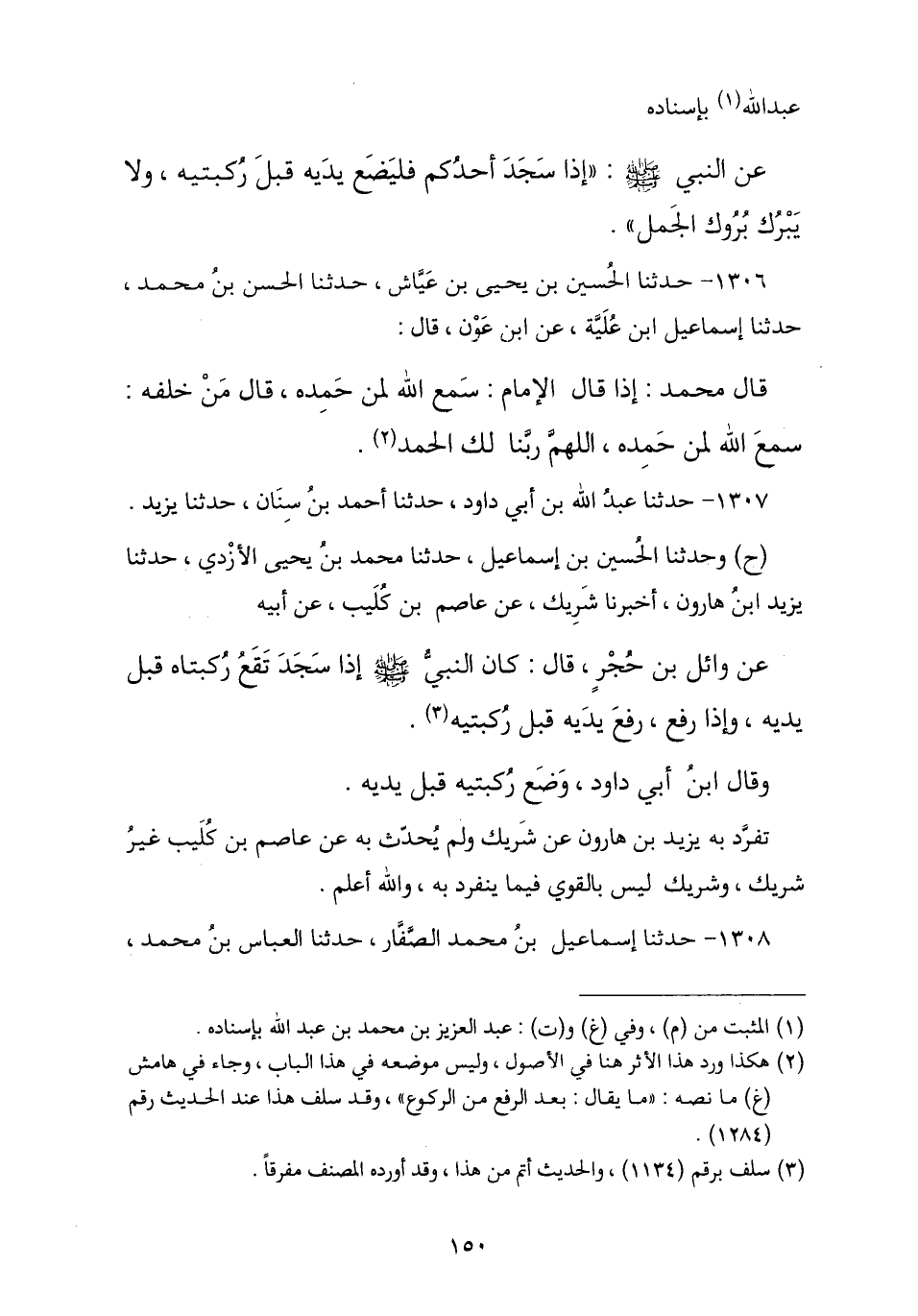 1307 - حَدَّثَنَا عَبْدُ اللَّهِ بْنُ أَبِي دَاوُدَ , ثنا أَحْمَدُ بْنُ سِنَانٍ , ثنا يَزِيدُ , ح وَحَدَّثَنَا الْحُسَيْنُ بْنُ إِسْمَاعِيلَ , ثنا مُحَمَّدُ بْنُ يَحْيَى الْأَزْدِيُّ , ثنا يَزِيدُ بْنُ هَارُونَ , أنا شَرِيكٌ , عَنْ عَاصِمِ بْنِ كُلَيْبٍ , عَنْ أَبِيهِ , عَنْ وَائِلِ بْنِ حُجْرٍ , قَالَ: كَانَ النَّبِيُّ صَلَّى اللهُ عَلَيْهِ وَسَلَّمَ § «إِذَا يَسْجُدُ تَقَعُ رُكْبَتَاهُ قَبْلَ يَدَيْهِ , وَإِذَا رَفَعَ رَفَعَ يَدَيْهِ قَبْلَ رُكْبَتَيْهِ». وَقَالَ ابْنُ أَبِي دَاوُدَ: وَوَضَعَ رُكْبَتَيْهِ قَبْلَ يَدَيْهِ. تَفَرَّدَ بِهِ يَزِيدُ , عَنْ شَرِيكٍ , وَلَمْ يُحَدِّثْ بِهِ عَنْ عَاصِمِ بْنِ كُلَيْبٍ غَيْرُ شَرِيكٍ , وَشَرِيكٌ لَيْسَ بِالْقَوِيِّ فِيمَا يَتَفَرَّدُ بِهِ وَاللَّهُ أَعْلَمُ