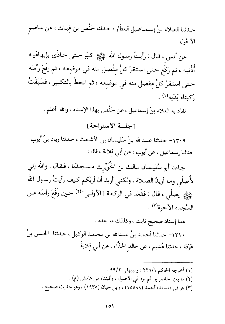 1310 - حَدَّثَنَا أَحْمَدُ بْنُ عَبْدِ اللَّهِ بْنِ مُحَمَّدٍ الْوَكِيلُ , ثنا الْحَسَنُ بْنُ عَرَفَةَ , ثنا هُشَيْمٌ , عَنْ خَالِدٍ الْحَذَّاءِ , عَنْ أَبِي قِلَابَةَ , -[152]- عَنْ مَالِكِ بْنِ الْحُوَيْرِثِ اللَّيْثِيِّ , قَالَ: رَأَيْتُ النَّبِيَّ صَلَّى اللهُ عَلَيْهِ وَسَلَّمَ وَهُوَ يُصَلِّي «فَكَانَ إِذَا كَانَ فِي الرَّكْعَةِ الْأُولَى أَوِ الثَّالِثَةِ §لَمْ يَنْهَضْ حَتَّى يَسْتَوِي قَاعِدًا». هَذَا صَحِيحٌ