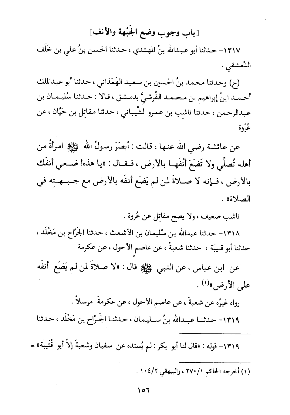 1318 - حَدَّثَنَا عَبْدُ اللَّهِ بْنُ سُلَيْمَانَ بْنِ الْأَشْعَثِ , ثنا الْجَرَّاحُ بْنُ مَخْلَدٍ , حَدَّثَنَا -[157]- أَبُو قُتَيْبَةَ , ثنا شُعْبَةُ , عَنْ عَاصِمٍ الْأَحْوَلِ , عَنْ عِكْرِمَةَ , عَنِ ابْنِ عَبَّاسٍ , عَنِ النَّبِيِّ صَلَّى اللهُ عَلَيْهِ وَسَلَّمَ , قَالَ: § «لَا صَلَاةَ لِمَنْ لَمْ يَضَعْ أَنْفَهُ عَلِي الْأَرْضِ». وَرَوَاهُ غَيْرُهُ عَنْ شُعْبَةَ , عَنْ عَاصِمٍ , عَنْ عِكْرِمَةَ مُرْسَلًا